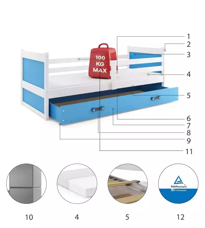 RICO viengulė jaunimo lova 90×190 su stalčiumi, balta/mėlyna