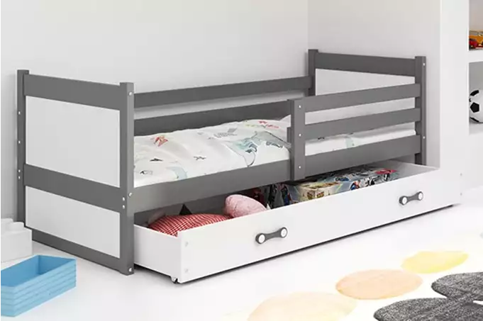 RICO viengulė jaunimo lova 90×200 su čiužiniu ir stalčiumi, grafito spalvos/balta