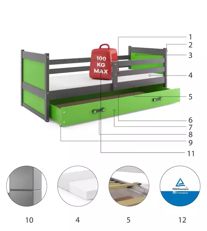 Būkite pirmas aprašęs “RICO viengulė jaunimo lova 90×200 su čiužiniu ir stalčiumi, grafito/žalia”