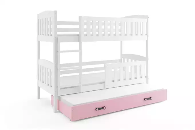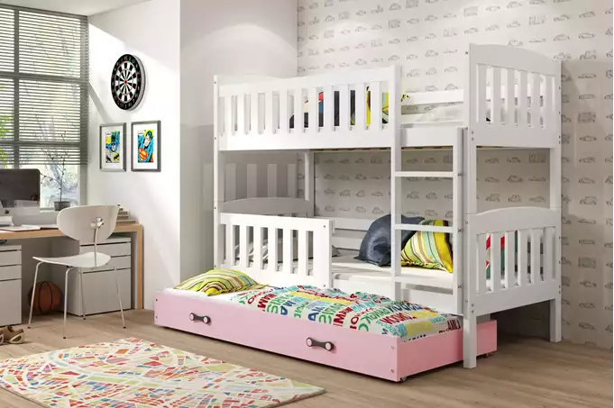 Lovos rėmas – pagamintas iš pušies medienos, dažytas vandens pagrindo laku. Surinkimo priedai – greitas ir paprastas surinkimas. Rėmas – esame vienintelė įmonė, siūlanti rėmą, pagamintą iš spyruoklinių beržo medienos lentelių, tvirtinamą PVC laikikliu ant metalinės juostelės, naudojant spragtelėjimo sistemą (greitas surinkimas). Čiužiniai – 190×90 (2 vnt.), 180×80 (1 vnt.), su nuimamu užvalkalu, oro kondicionavimo pluoštu ir poliuretano putomis. Užvalkalas – dygsniuotas hipoalerginis poliesterio audinys, su užtrauktuku. Stalčius – pagamintas iš laminuotos medžio drožlių plokštės, turi papildomą miegojimo funkciją. Stalčiaus rankena – pagaminta iš PVC. Stalčiaus ratukai. Apvalinimas – spindulys R2. Keliamoji galia – 100 kg kiekvienam lygiui. Sertifikuota lova – kokybė ir saugumas pagal TUV standartus.
