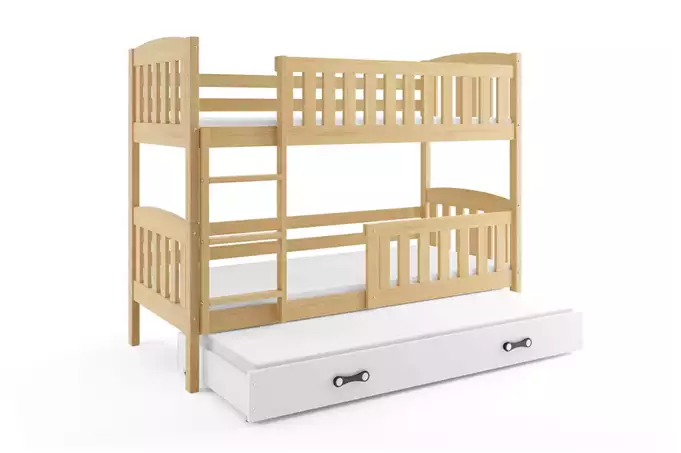 Lovos rėmas – pagamintas iš nedažytos pušies medienos. Surinkimo priedai – greitas ir paprastas surinkimas. Rėmas – esame vienintelė įmonė, siūlanti rėmą, pagamintą iš spyruoklinių beržo medienos lentelių, tvirtinamą PVC laikikliu ant metalinės juostelės, naudojant spragtelėjimo sistemą (greitas surinkimas). Čiužiniai – 190×90 (2 vnt.), 180×80 (1 vnt.), su nuimamu užvalkalu, oro kondicionavimo pluoštu ir poliuretano putomis. Užvalkalas – dygsniuotas hipoalerginis audinys, pagamintas iš poliesterio, su užtrauktuku. Stalčius – pagamintas iš laminuotos medžio drožlių plokštės, turi papildomą miegojimo funkciją. Stalčiaus rankena – pagaminta iš PVC. Stalčiaus ratukai. Apvalinimas – spindulys R2. Maksimali apkrova – 100 kg kiekvienam lygiui. Sertifikuota lova – kokybė ir saugumas pagal TUV standartus.