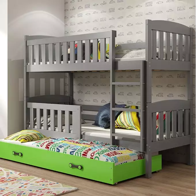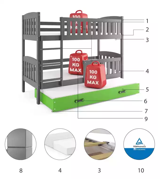 Būkite pirmas aprašęs “KUBUŚ 90X200 trijų asmenų jaunimo lova su čiužiniu ir stalčiumi, grafito/žalia”