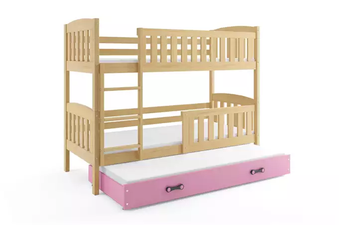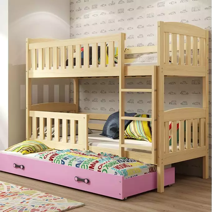 Lovos rėmas – pagamintas iš pušies medienos, dažytas vandens pagrindo laku. Surinkimo priedai – greitas ir paprastas surinkimas. Rėmas – esame vienintelė įmonė, siūlanti rėmą iš spyruoklinių lentelių, pagamintą iš beržo medienos, pritvirtintą PVC rankena ant metalinės juostelės, su spragtelėjimo sistema (greitas surinkimas). Čiužinys: nėra. Stalčius – pagamintas iš laminuotos medžio drožlių plokštės, turi papildomą miegojimo funkciją. Stalčiaus rankena – pagaminta iš PVC. Stalčiaus ratukai. Apvalinimas – spindulys R2. Keliamoji galia – 100 kg vienam lygiui. Sertifikuota lova – kokybė ir saugumas pagal TUV standartus.