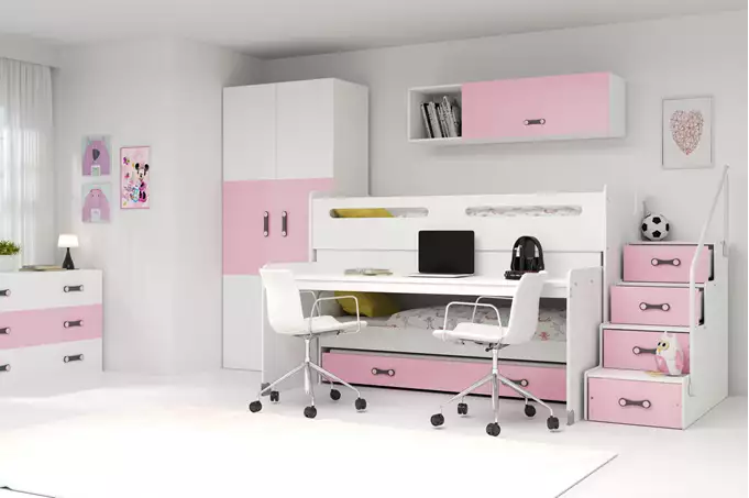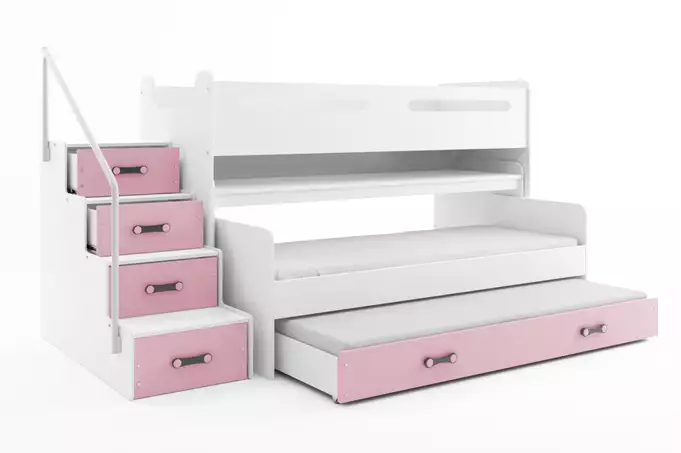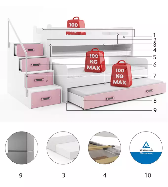 MDF plokštė – dažyta vandens pagrindo laku. Laminuota medžio drožlių plokštė. Čiužiniai – 200x80x9 (1 vnt.), 190x80x9 (1 vnt.), 180x80x7 (1 vnt.), su nuimamu užvalkalu, oro kondicionavimo pluoštu ir poliuretano putomis. Užvalkalas – dygsniuotas hipoalerginis poliesterio audinys, su užtrauktuku. Rėmas – esame vienintelė įmonė, siūlanti rėmą iš spyruoklinių lentelių, pagaminto iš beržo medienos, tvirtinamo PVC rankena ant metalinės juostelės, su spragtelėjimo sistema (greitas surinkimas). Surinkimo priedai – greitas ir paprastas surinkimas. Stalčiaus rankena – pagaminta iš PVC. Bėgelis. Stalčiaus ratukai. Apvalinimo spindulys – R2. Sertifikuota lova – kokybė ir saugumas pagal TUV standartus. Keliamoji galia – 100 kg vienam lygiui.