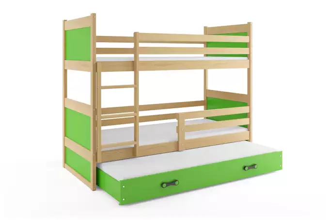 Lovos rėmas – pagamintas iš pušies medienos, nedažytas. Surinkimo priedai – greitas ir paprastas surinkimas. Rėmas – esame vieninteliai, siūlantys rėmą iš spyruoklinių lentelių, pagamintą iš beržo medienos, tvirtinamą PVC rankena ant metalinės juostelės, su spragtelėjimo sistema (greitas surinkimas). MDF plokštė – dažyta vandens pagrindo laku. Čiužiniai – 190×90 (2 vnt.), 180×80 (1 vnt.), su nuimamu užvalkalu, oro kondicionavimo pluoštu ir poliuretano putomis. Užvalkalas – dygsniuotas hipoalerginis audinys, pagamintas iš poliesterio, su užtrauktuku. Stalčius – pagamintas iš medžio drožlių plokštės, turi papildomą miegojimo funkciją. Stalčiaus rankena – pagaminta iš PVC. Stalčiaus ratukai. Apvalinimas – spindulys R2. Maksimali apkrova – 100 kg kiekvienam lygiui. Sertifikuota lova – kokybė ir saugumas pagal TUV standartus.