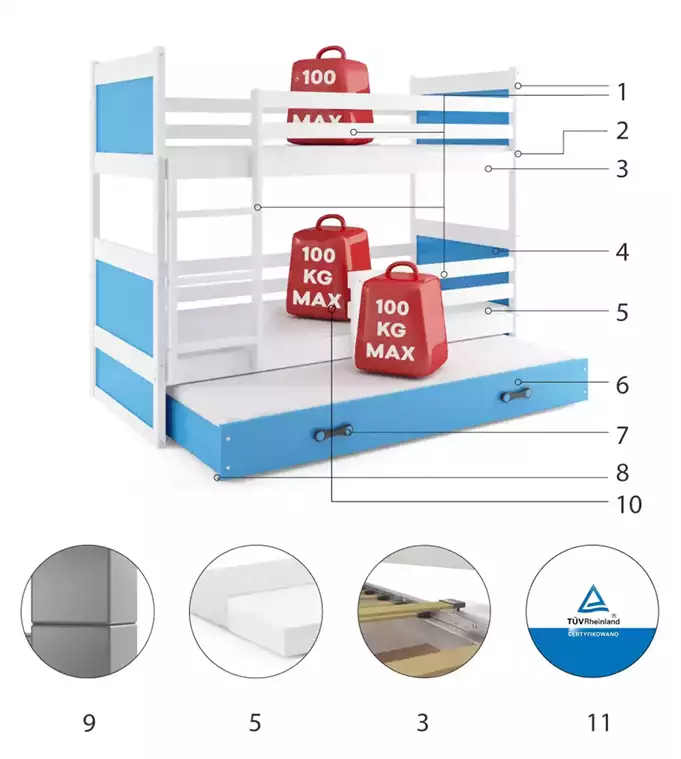 Lovos rėmas – pagamintas iš pušies medienos, dažytas vandens pagrindo laku. Surinkimo priedai – greitas ir paprastas surinkimas. Rėmas – esame vienintelė įmonė, siūlanti rėmą iš spyruoklinių lentelių, pagamintą iš beržo medienos, tvirtinamą PVC rankena ant metalinės juostelės, su spragtelėjimo sistema (greitas surinkimas). MDF plokštė – dažyta vandens pagrindo laku. Čiužiniai – 200×90 (2 vnt.), 190×80 (1 vnt.), su nuimamu užvalkalu, su oro kondicionavimo pluoštu ir poliuretano putomis. Užvalkalas – dygsniuotas hipoalerginis audinys, pagamintas iš poliesterio, su užtrauktuku. Stalčius – pagamintas iš medžio drožlių plokštės, turi papildomą miegojimo funkciją. Stalčiaus rankena – pagaminta iš PVC. Stalčiaus ratukai. Apvalinimas – spindulys R2. Maksimali apkrova – 100 kg kiekvienam lygiui. Sertifikuota lova – kokybė ir saugumas pagal TUV standartus.