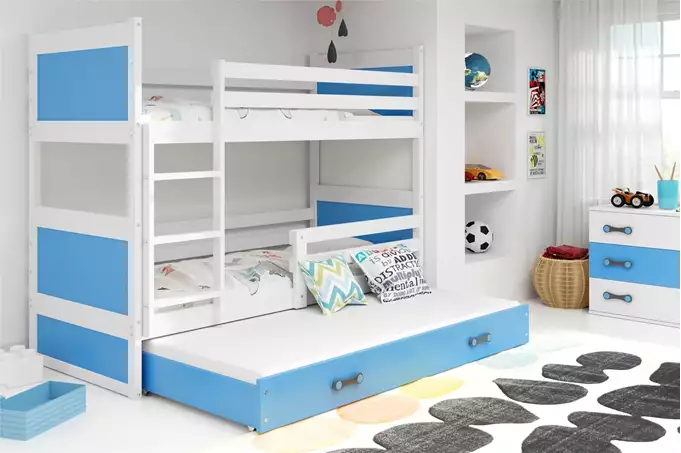 RICO 90X200 trijų asmenų jaunimo lova su čiužiniu ir stalčiumi, balta/mėlyna