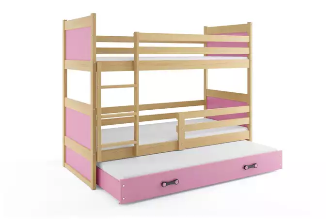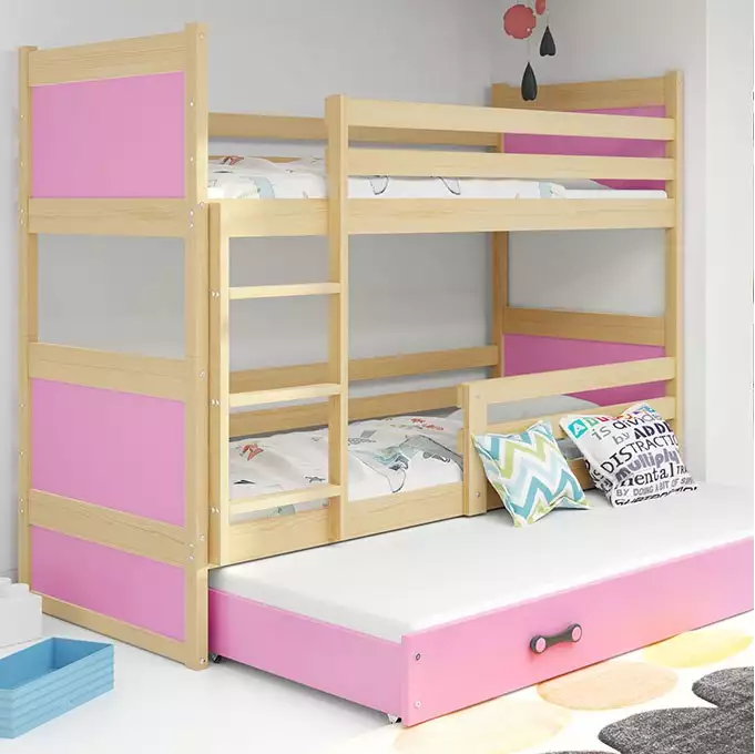 RICO 90X200 trijų asmenų jaunimo lova su čiužiniu ir stalčiumi, pušis/rožinė