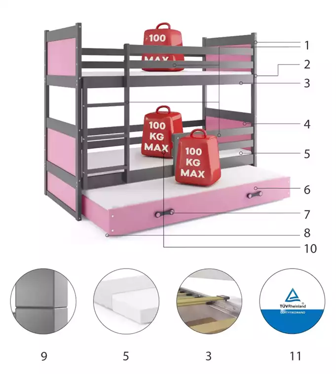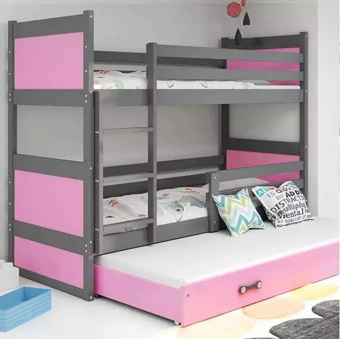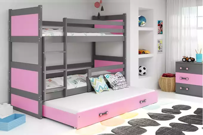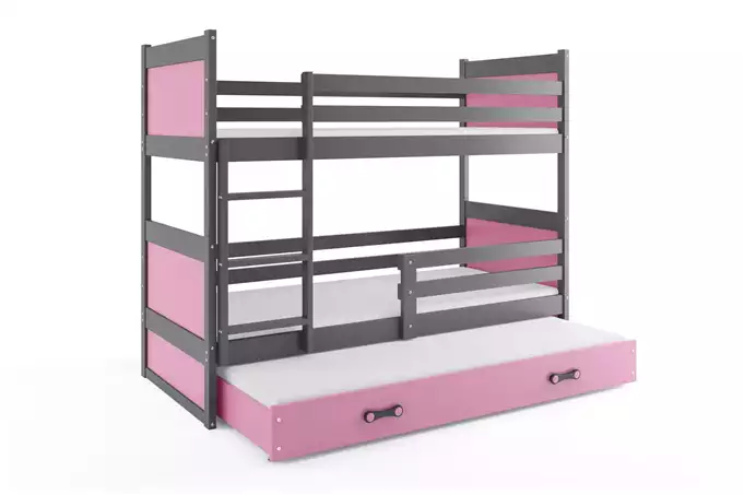 RICO 90X200 trijų asmenų jaunimo lova su stalčiumi, grafito/rožinė