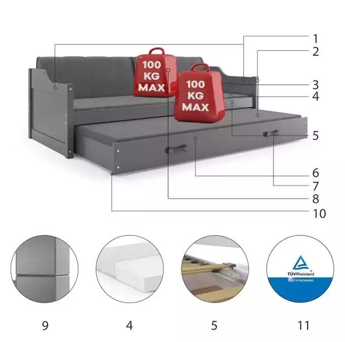 Lovos rėmas – pagamintas iš pušies medienos, dažytas vandens pagrindo laku. Surinkimo priedai – greitas ir paprastas surinkimas. MDF plokštė – dažyta vandens pagrindo laku. Čiužiniai – 200×90 (1 vnt.), 190×80 (1 vnt.), su nuimamu užvalkalu, oro kondicionavimo pluoštu ir poliuretano putomis. Užvalkalas – dygsniuotas hipoalerginis poliesterio audinys, su užtrauktuku. Rėmas – esame vienintelė įmonė, siūlanti rėmą, pagamintą iš spyruoklinių beržo medienos lentelių, pritvirtintą PVC rankena ant metalinės juostelės, su spragtelėjimo sistema (greitas surinkimas). Stalčius – pagamintas iš medžio drožlių plokštės, turi papildomą miegojimo funkciją. Stalčiaus rankena – pagaminta iš PVC. Keliamoji galia – 100 kg kiekvienam lygiui. Apvalinimas – R2 spindulys. Stalčių ratukai. Sertifikuota lova – kokybė ir saugumas pagal TUV standartus.