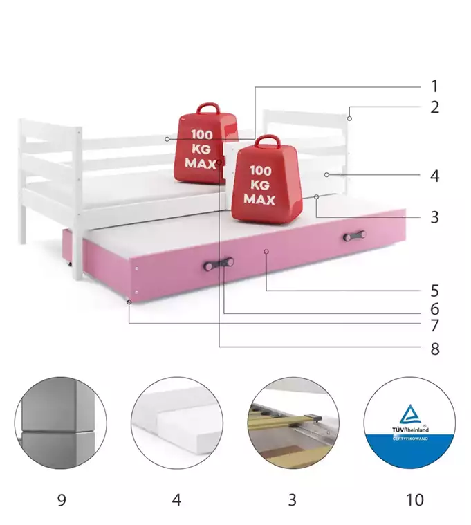 ERYK 90×200 jaunimo išskleidžiama lova su stalčiumi, balta/rožinė