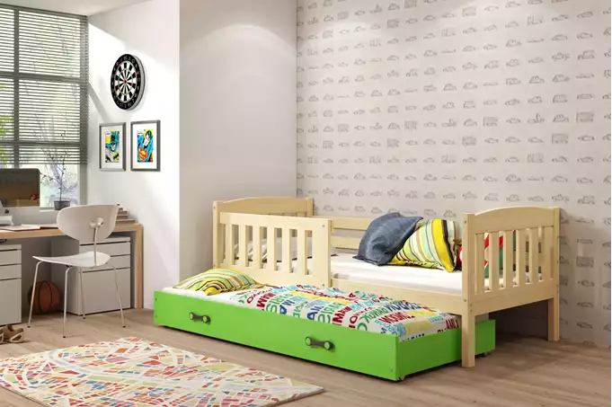 KUBUŚ jaunimo išskleidžiama lova 90×190 su stalčiumi, pušis/žalia