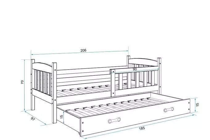 Lovos rėmas – pagamintas iš pušies medienos, dažytas vandens pagrindo laku. Surinkimo priedai – greitas ir paprastas surinkimas. Čiužinys: nėra. Rėmas – esame vienintelė įmonė, siūlanti rėmą iš spyruoklinių lentelių, pagamintą iš beržo medienos, pritvirtintą PVC rankena ant metalinės juostelės, su spragtelėjimo sistema (greitas surinkimas). Stalčius – pagamintas iš medžio drožlių plokštės, turi papildomą miegojimo funkciją. Stalčiaus rankena – pagaminta iš PVC. Stalčiaus ratukai. Apvalinimas – spindulys R2. Keliamoji galia – 100 kg vienam lygiui. Sertifikuota lova – kokybė ir saugumas pagal TUV standartus.