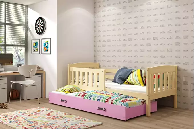 KUBUŚ jaunimo išskleidžiama lova 90×200 su stalčiumi, pušis/rožinė