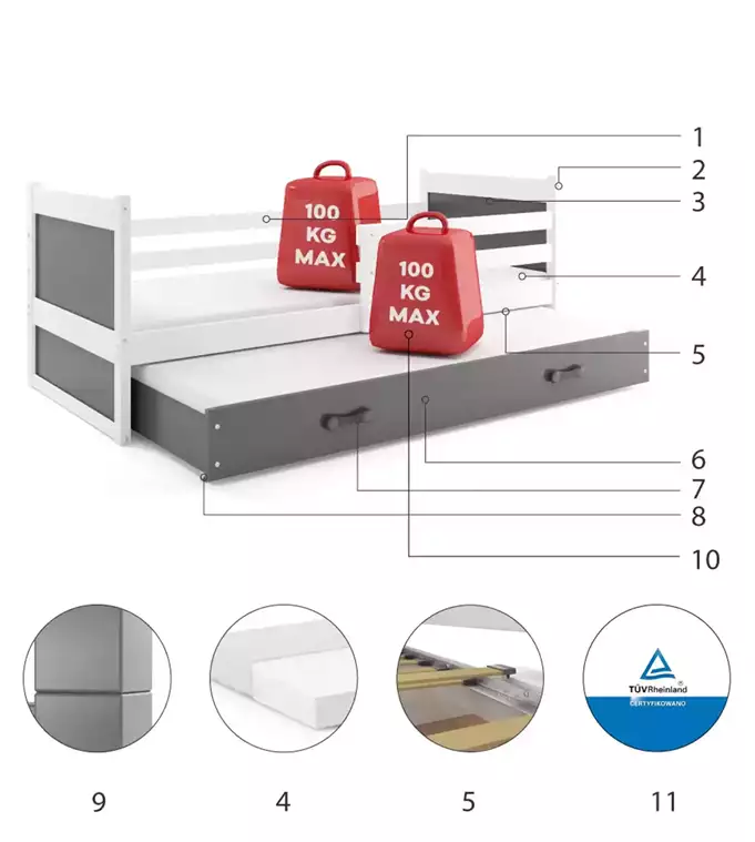 Lovos rėmas – pagamintas iš pušies medienos, dažytas vandens pagrindo laku. Surinkimo priedai – greitas ir paprastas surinkimas. MDF plokštė – dažyta vandens pagrindo laku. Čiužiniai – 200×90 (1 vnt.), 190×80 (1 vnt.), su nuimamu užvalkalu, oro kondicionavimo pluoštu ir poliuretano putomis. Užvalkalas – dygsniuotas, hipoalerginis audinys, pagamintas iš poliesterio, su užtrauktuku. Rėmas – esame vienintelė įmonė, siūlanti rėmą iš spyruoklinių lentelių, pagamintą iš beržo medienos, tvirtinamą PVC rankena ant metalinės juostelės, naudojant spragtelėjimo sistemą (greitas surinkimas). Stalčius – pagamintas iš medžio drožlių plokštės, turi papildomą miegojimo funkciją. Stalčiaus rankena – pagaminta iš PVC. Stalčiaus ratukai. Apvalinimas – spindulys R2. Keliamoji galia – 100 kg kiekvienam lygiui. Sertifikuota lova – kokybė ir saugumas pagal TUV standartus.