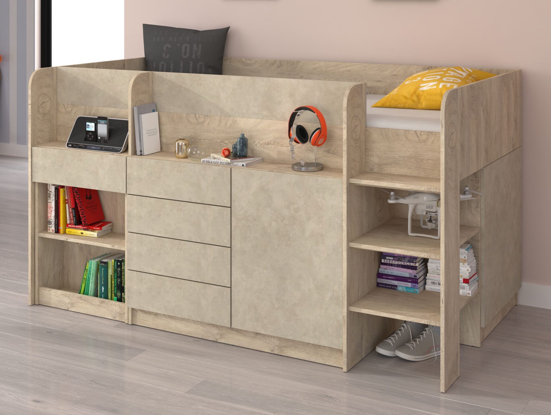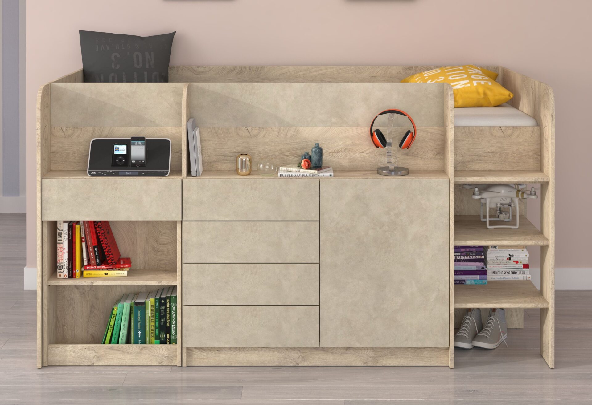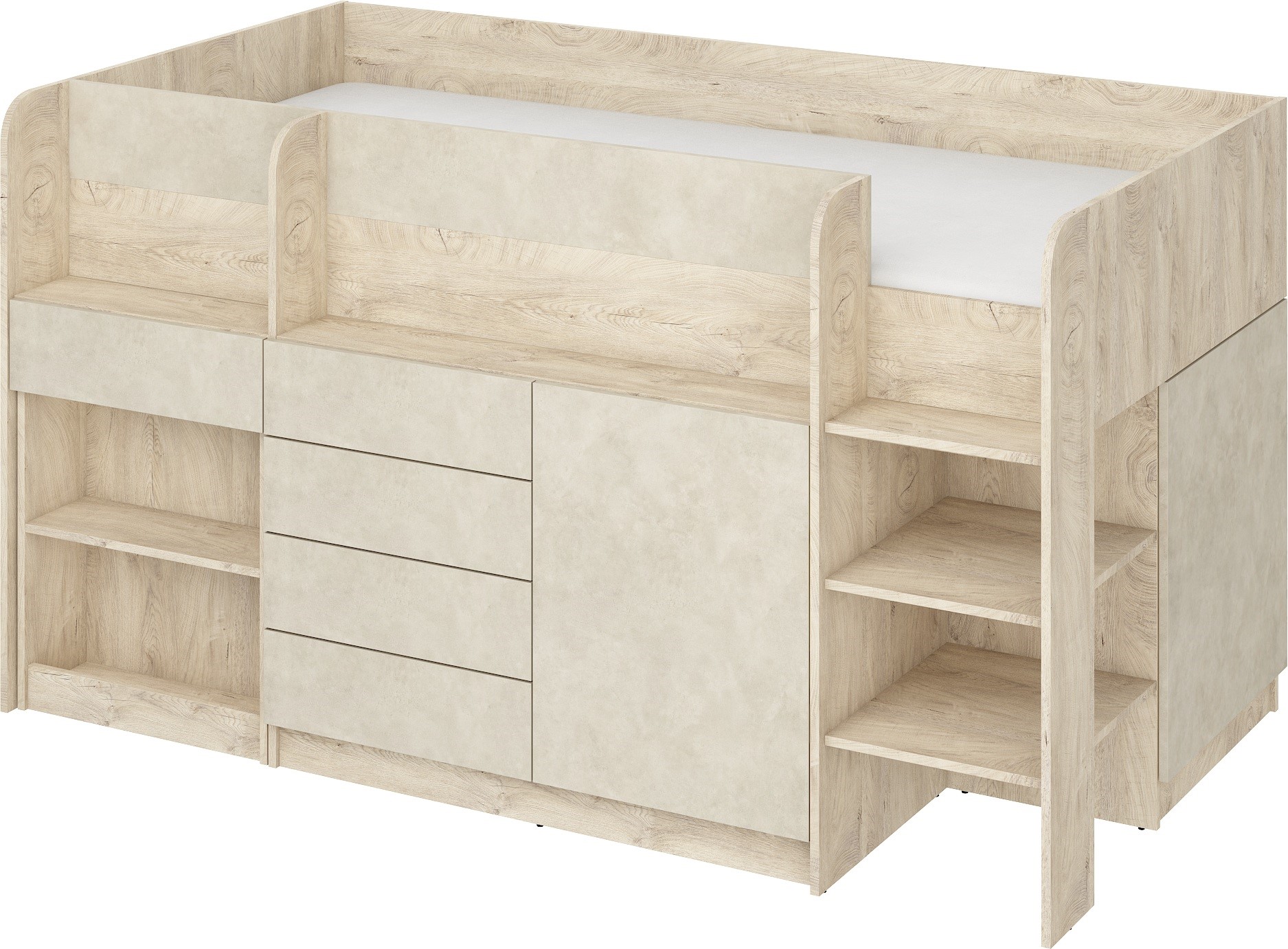 EMI P antresolė be čiužinio 90×200, 16 mm plokštė, ABS kraštas, atidarymas SPAUDŽIAMAS, maksimalus čiužinio aukštis 12 cm, spalva: ąžuolo kraštai / granados migdolų spalva