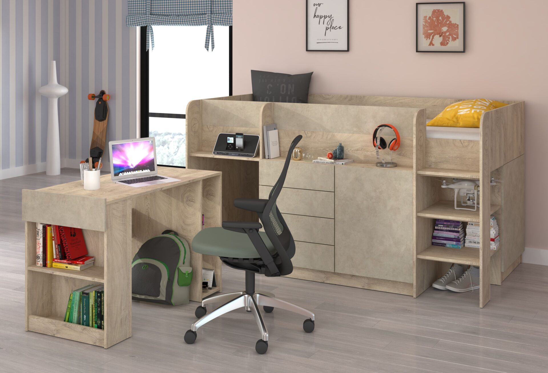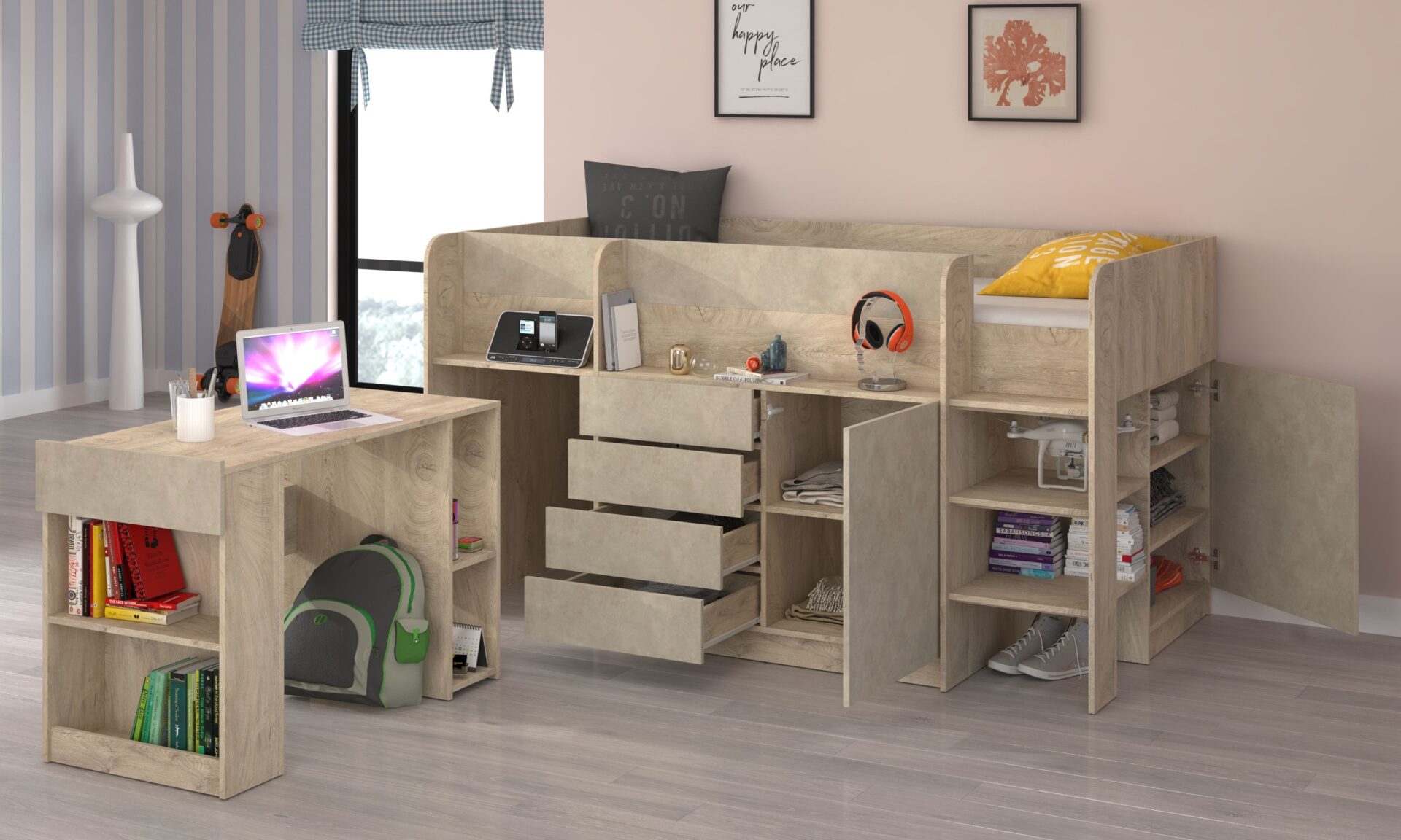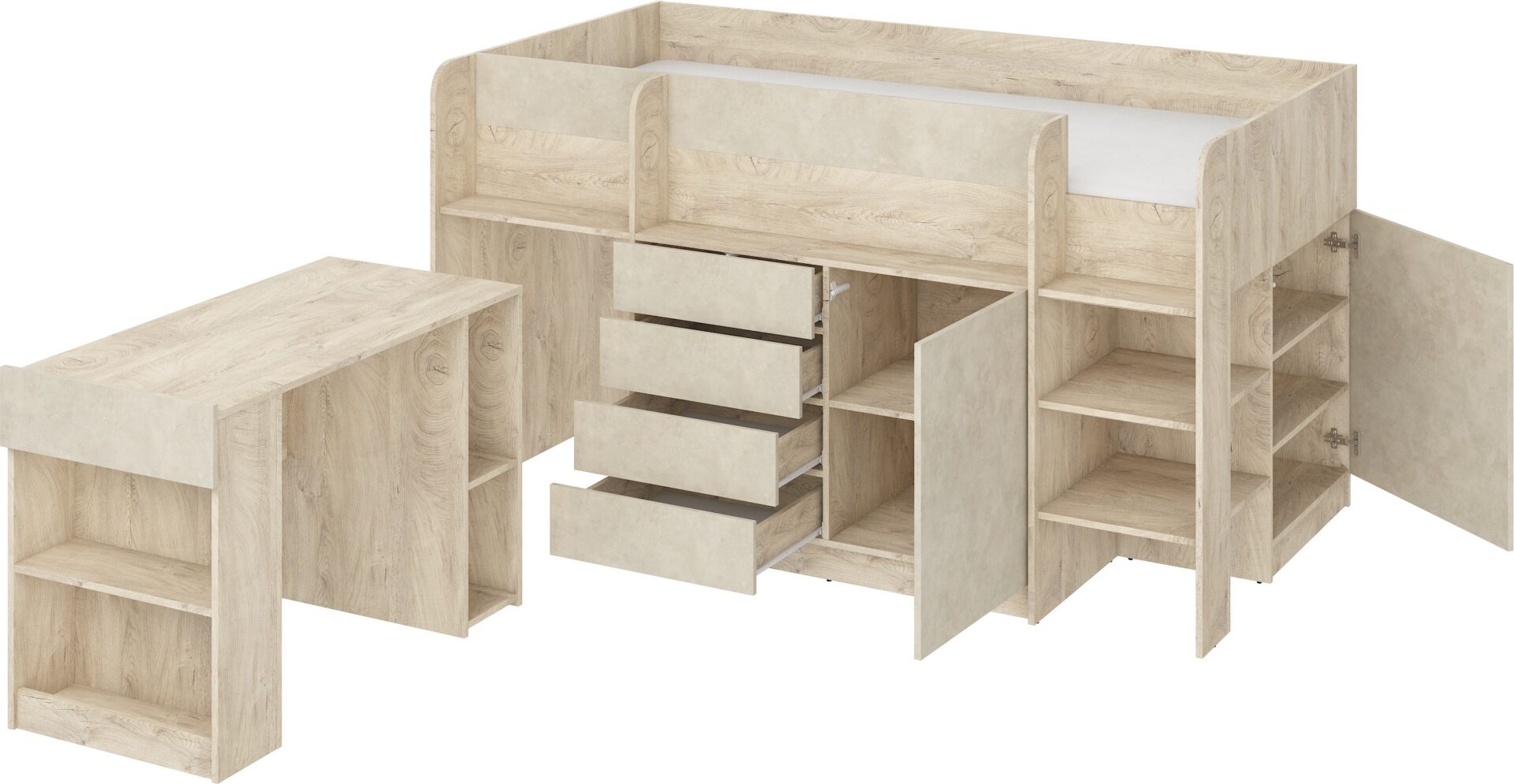 EMI P antresolė be čiužinio 90×200, 16 mm plokštė, ABS kraštas, atidarymas SPAUDŽIAMAS, maksimalus čiužinio aukštis 12 cm, spalva: ąžuolo kraštai / granados migdolų spalva