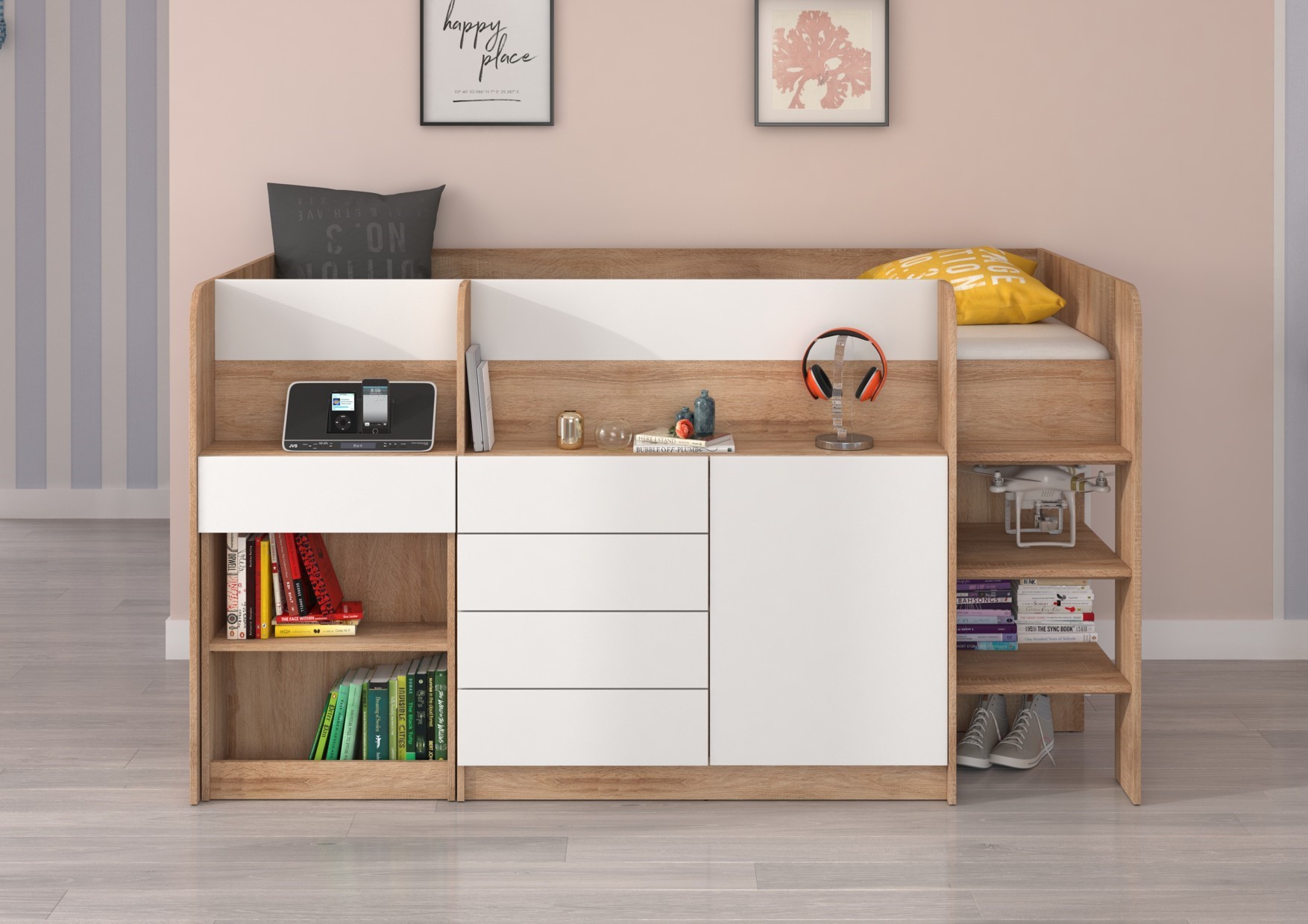 EMI P antresolė be čiužinio. 16 mm plokštė, ABS kraštas, atidaroma PASPAUSDANT, maksimalus čiužinio aukštis 12 cm. Spalva: Sonoma ąžuolas / balta.