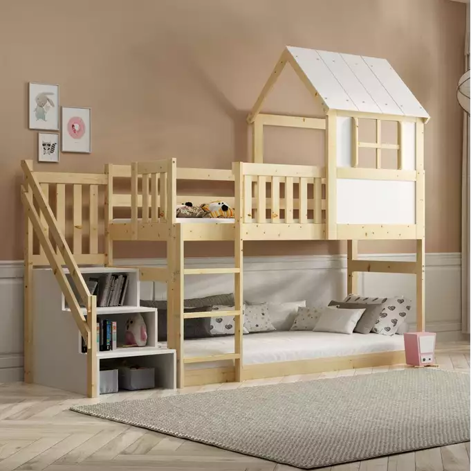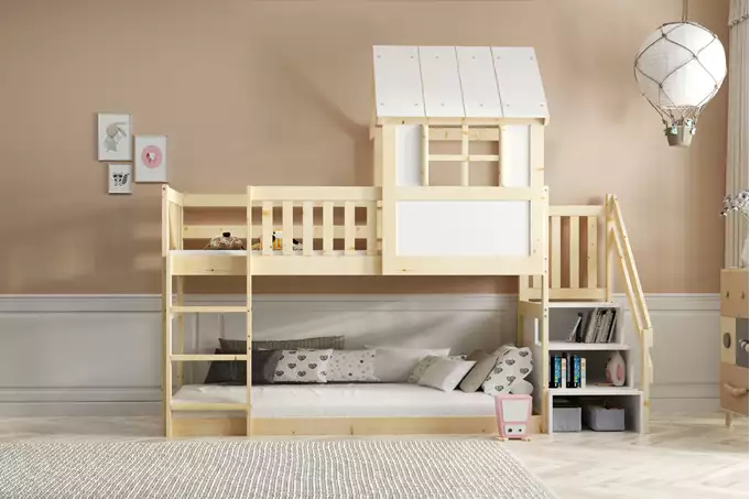 Komplektą sudaro: Lovos rėmas iš nedažytos pušies medienos. 1 čiužinys 200×90 (dygsniuotas hipoalerginis audinys iš poliesterio + oro kondicionavimo pluoštas + poliuretano putos + užtrauktukas). Pratęsimas – baldakimas su langeliu. Laiptai į lovą – patogus įėjimas vaikui, papildoma daiktadėžė. Saugus turėklas. Baldų furnitūra su instrukcijomis. Rėmas – siūlome rėmą iš spyruoklinių lentelių, pagamintų iš beržo medienos, tvirtinamą PVC laikikliu ant metalinės juostelės, naudojant „click-clack“ sistemą (greitas surinkimas). Suapvalintas spindulys R2 – suapvalinti lovos kraštai efektyviai sumažina traumų riziką, apsaugodami vaiką nuo įbrėžimų ir sumušimų žaidžiant ar keliantis. Maksimali apkrova 100 kg.