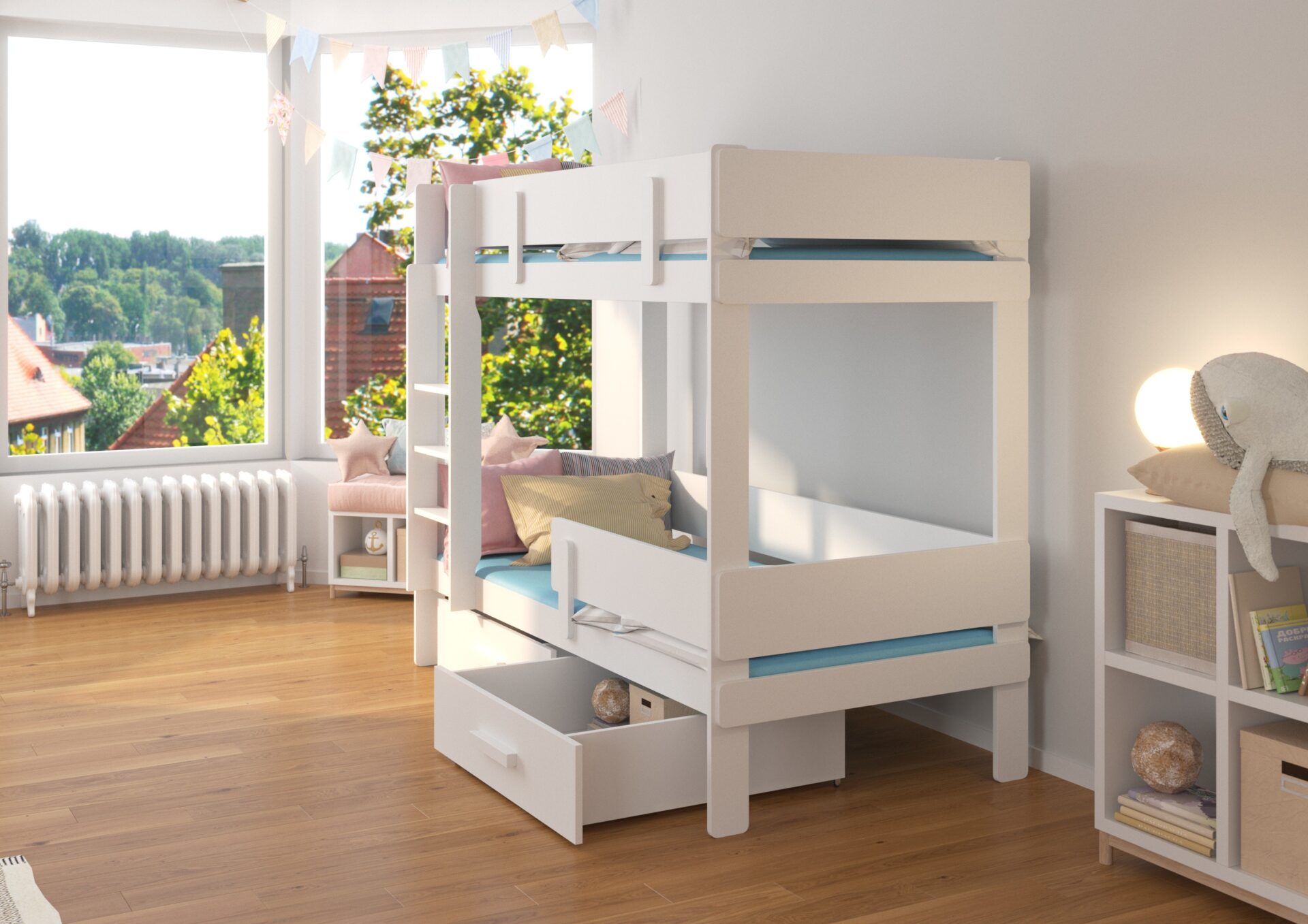 Dviaukštė lova „ETIONA“ – puikus būdas sutaupyti vietos mažame vaikų kambaryje. Joje yra kopėtėlės ir du erdvūs bei funkcionalūs stalčiai patalynei. Be to, dviejuose lygiuose yra apsauginiai turėklai, užtikrinantys didesnį saugumą miegant. Čiužiniai į komplektą neįeina.