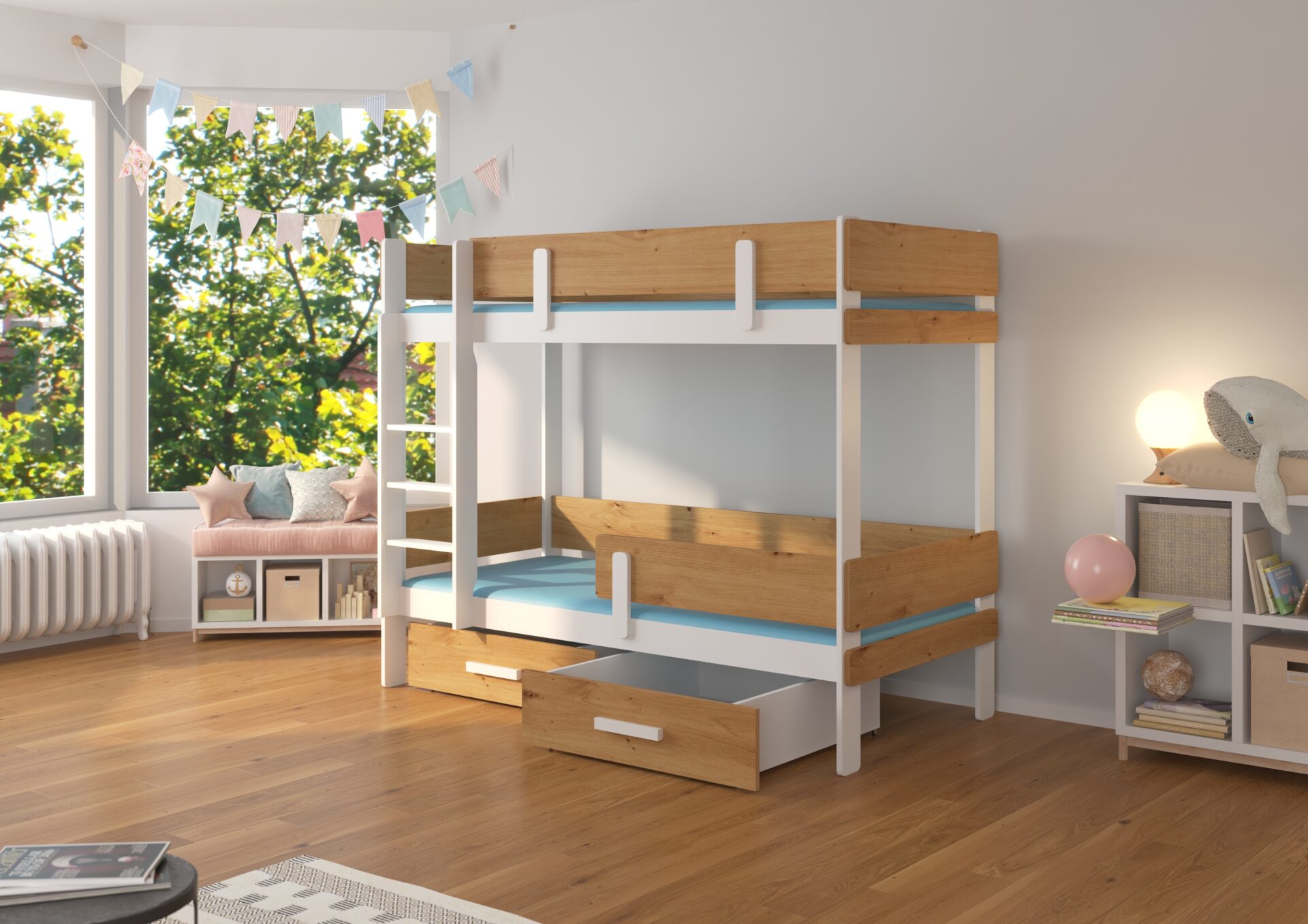 Dviaukštė lova „ETIONA“ – puikus būdas sutaupyti vietos mažame vaikų kambaryje. Joje yra kopėtėlės ir du erdvūs bei funkcionalūs stalčiai patalynei. Be to, dviejuose lygiuose yra apsauginiai turėklai, užtikrinantys didesnį saugumą miegant. Čiužiniai į komplektą neįeina.