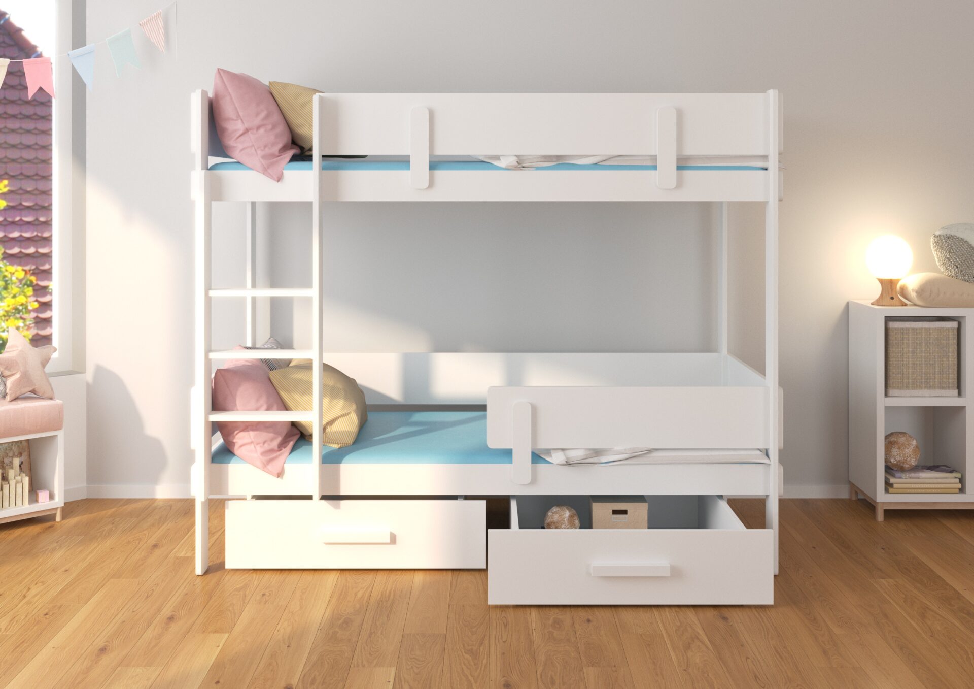Dviaukštė lova „ETIONA“ – puikus būdas sutaupyti vietos mažame vaikų kambaryje. Joje yra kopėtėlės ir du erdvūs bei funkcionalūs patalynės stalčiai. Be to, įrengti dviejų lygių turėklai, užtikrinantys didesnį saugumą miegant. Komplektą sudaro du 8 cm storio putplasčio čiužiniai.