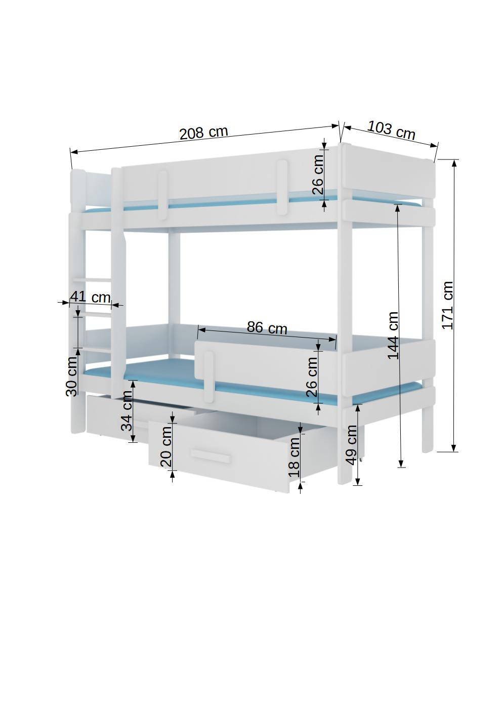 Dviaukštė lova „ETIONA“ – puikus būdas sutaupyti vietos mažame vaikų kambaryje. Joje yra kopėtėlės ir du erdvūs bei funkcionalūs patalynės stalčiai. Be to, įrengti dviejų lygių turėklai, užtikrinantys didesnį saugumą miegant. Komplektą sudaro du 8 cm storio putplasčio čiužiniai.