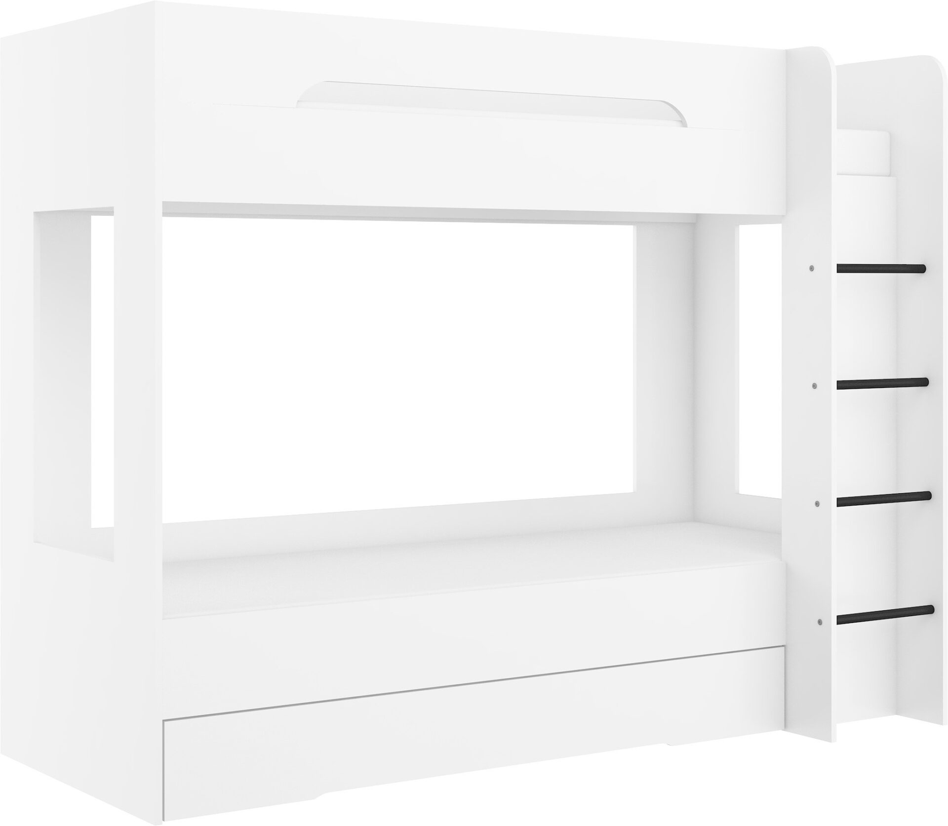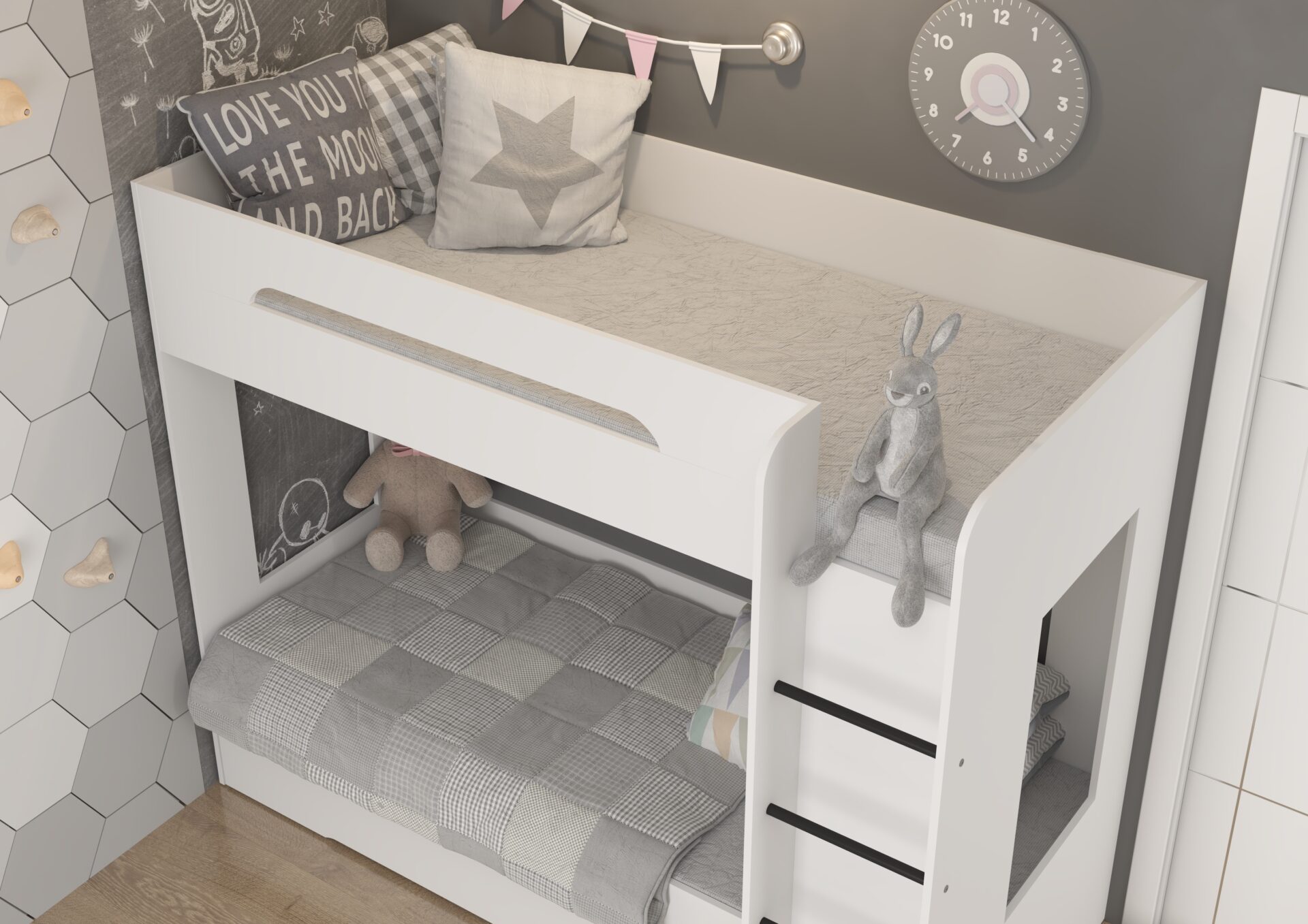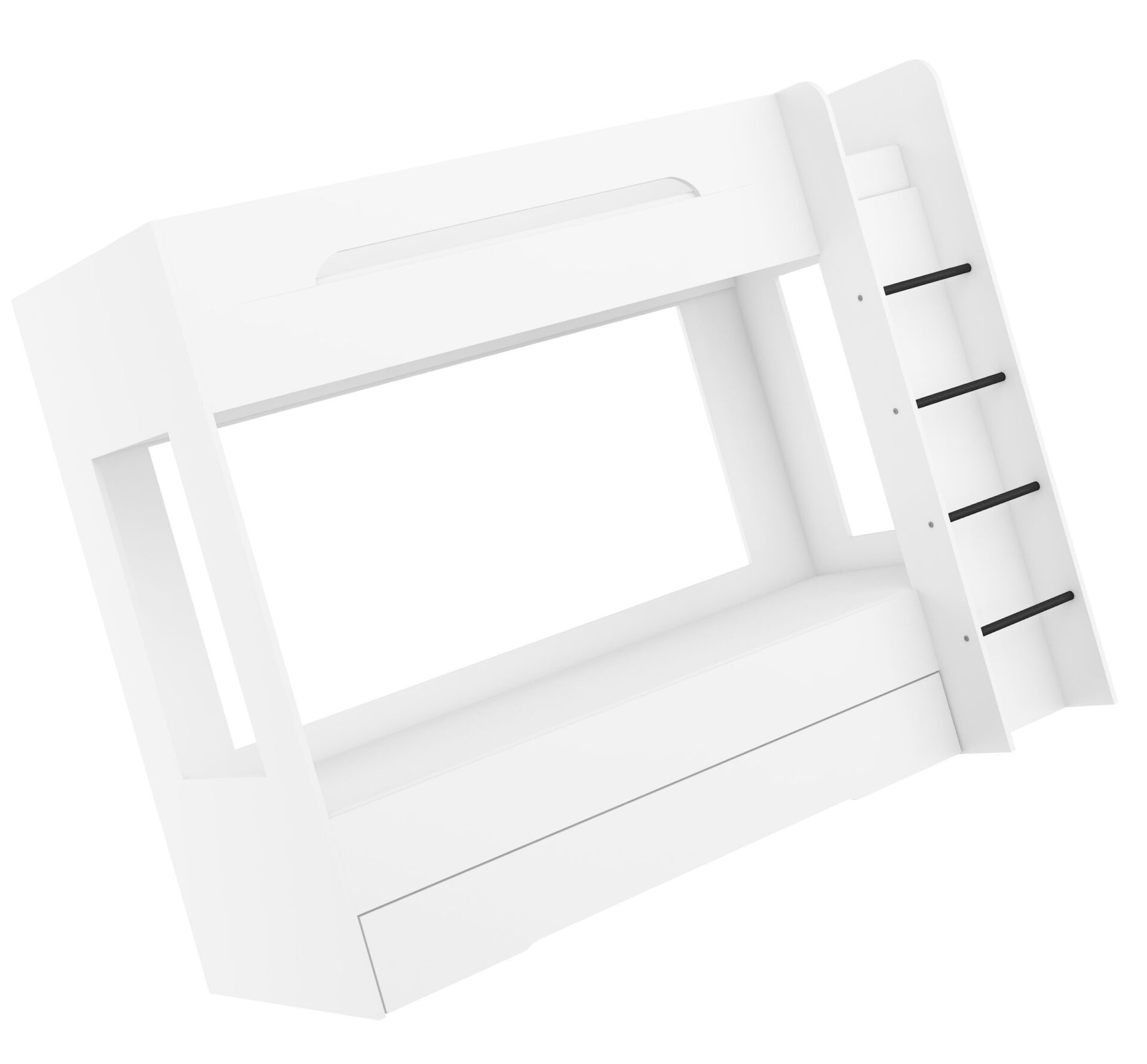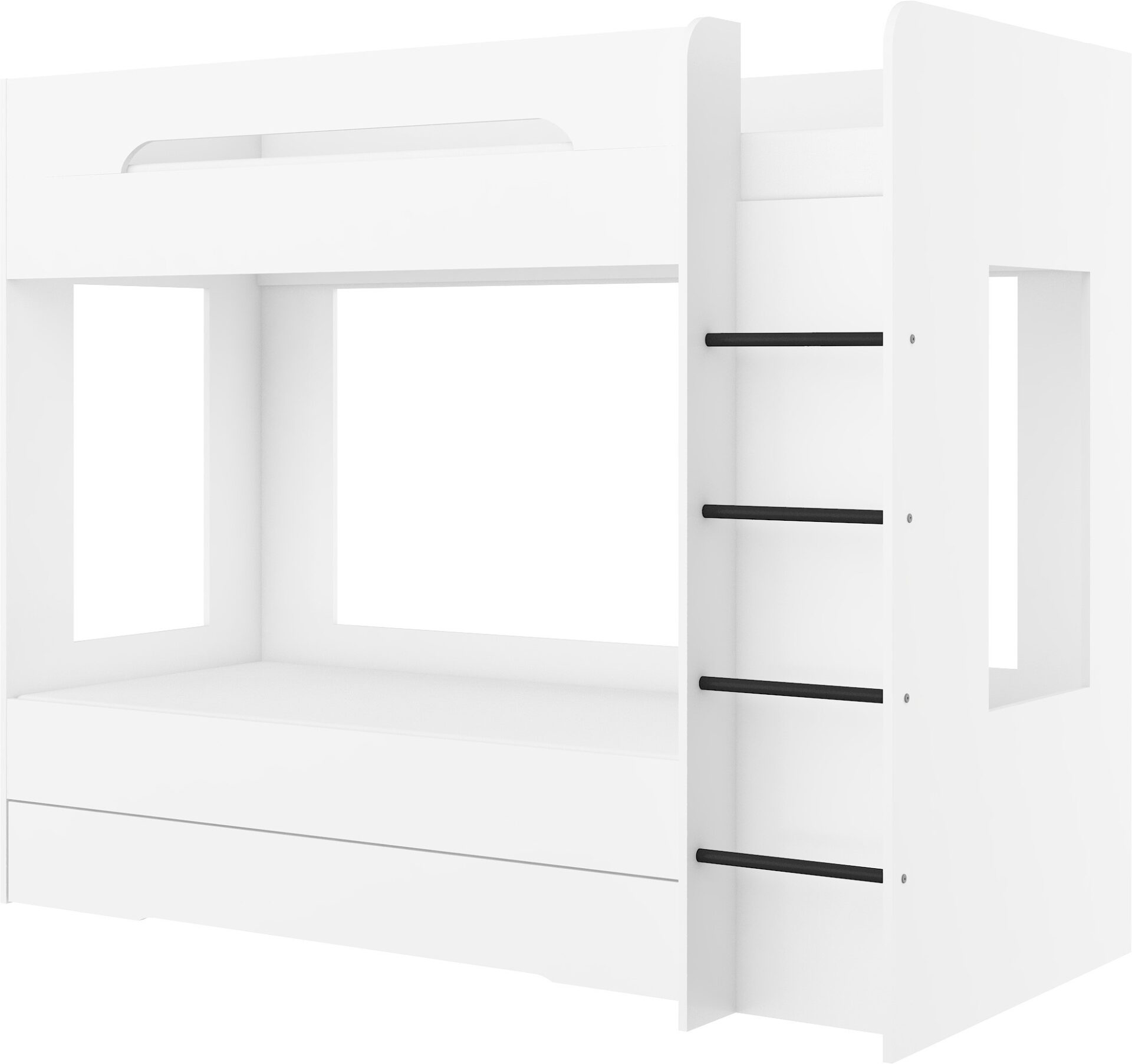 BLIN dviaukštė lova be čiužinio 80×200. 16 mm plokštė, ABS kraštas, maksimalus čiužinio aukštis 12 cm. Spalva: balta.