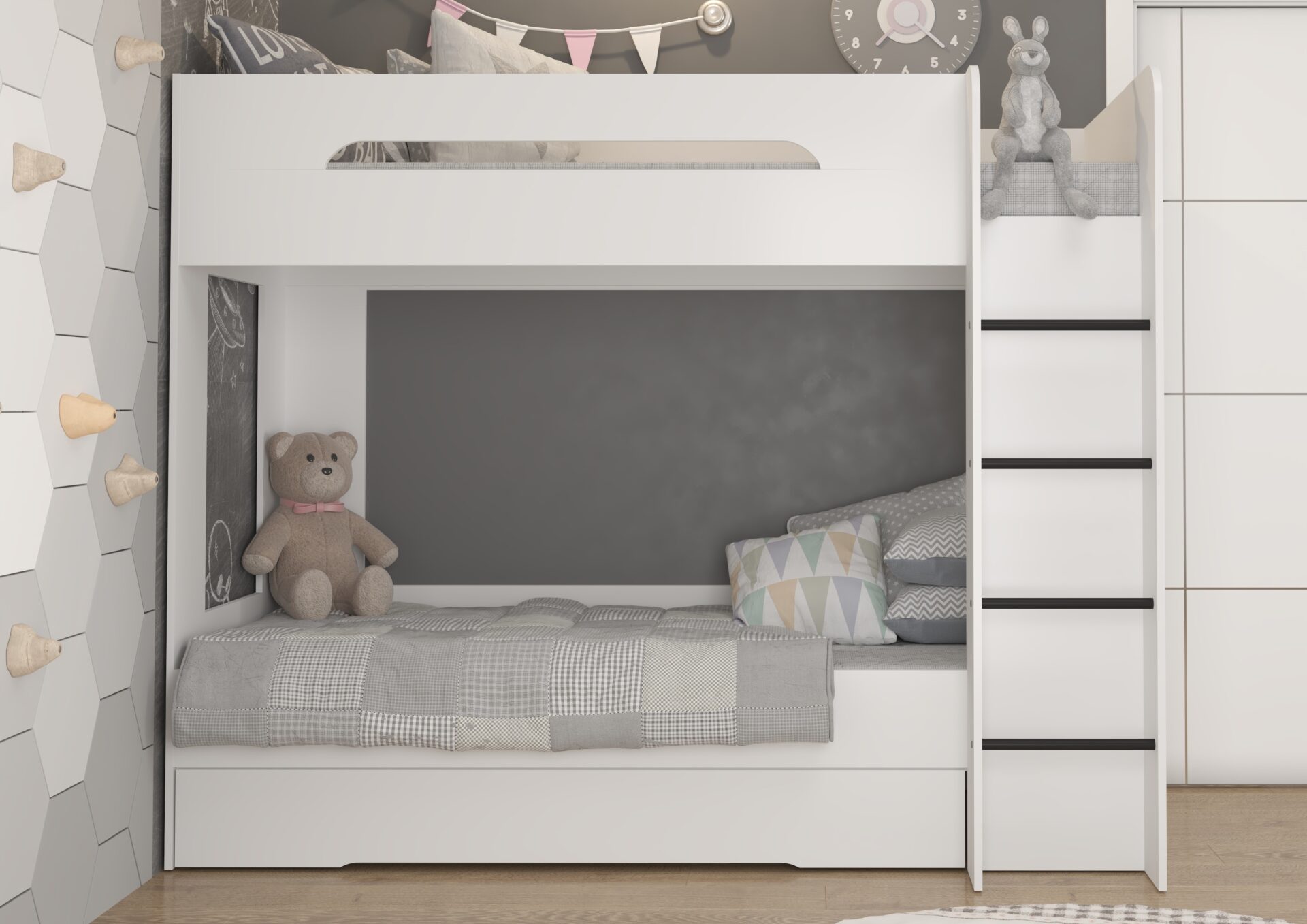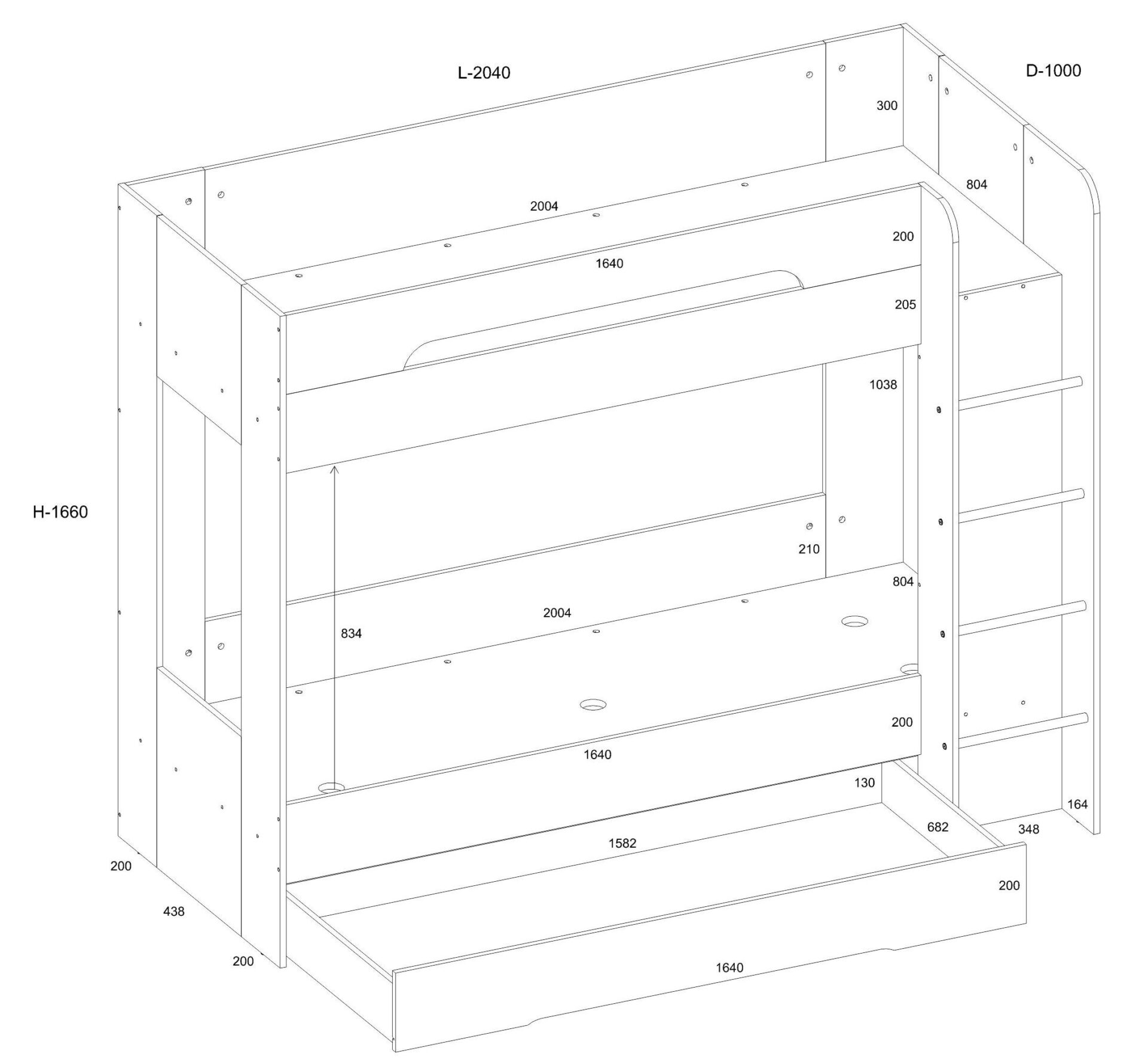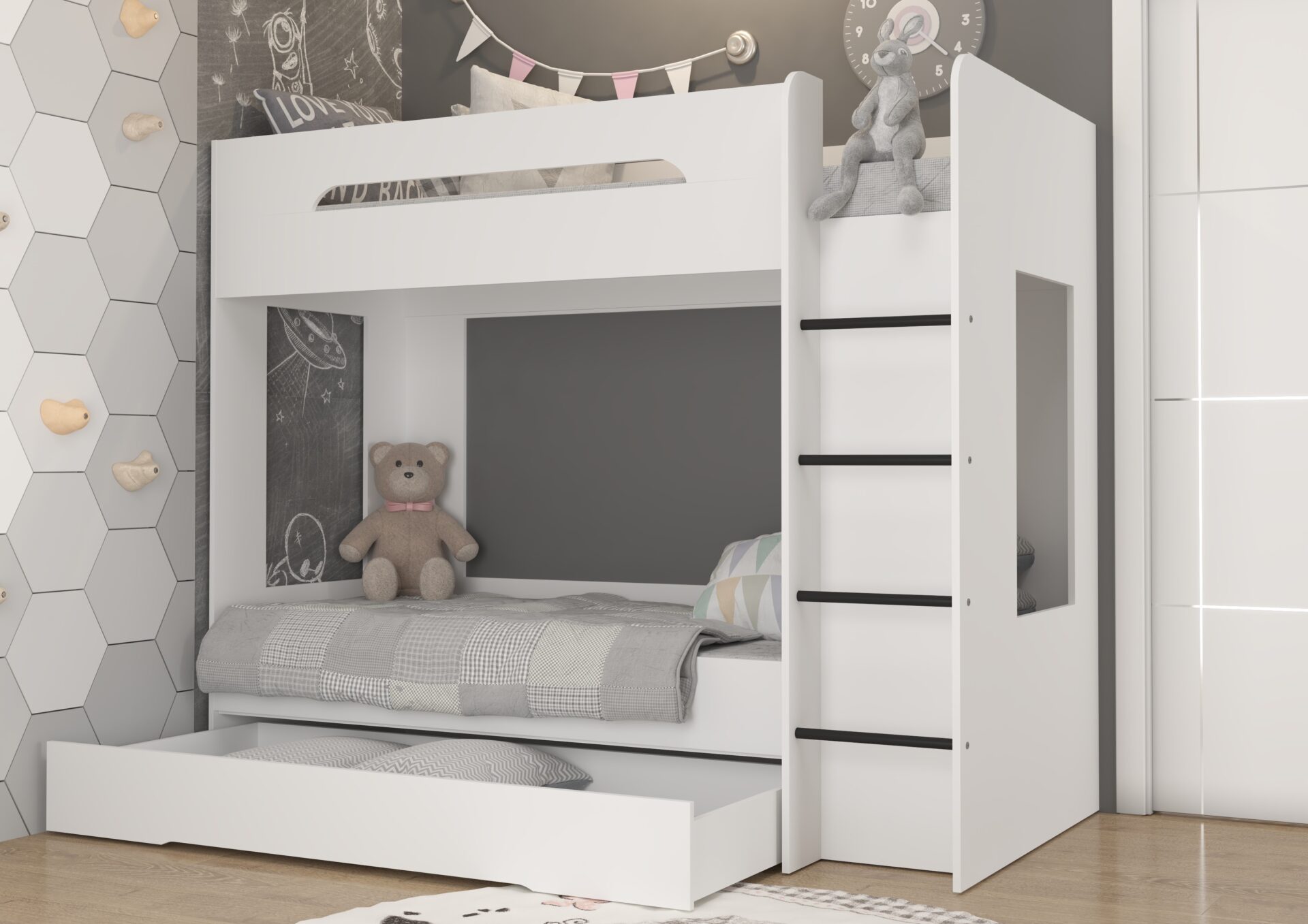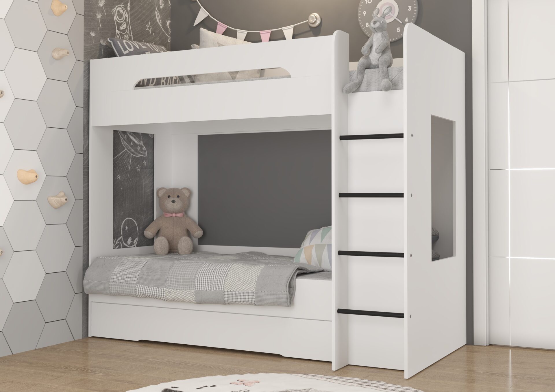 BLIN dviaukštė lova be čiužinio 80×200. 16 mm plokštė, ABS kraštas, maksimalus čiužinio aukštis 12 cm. Spalva: balta.