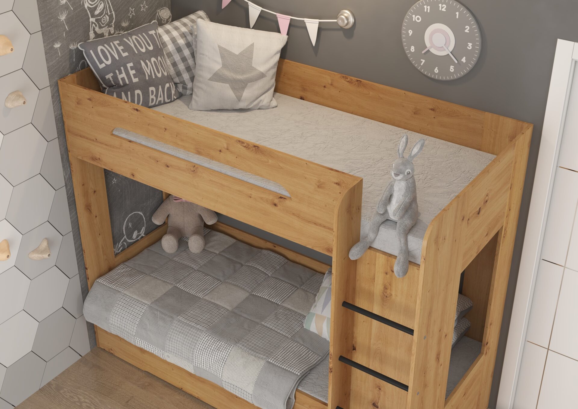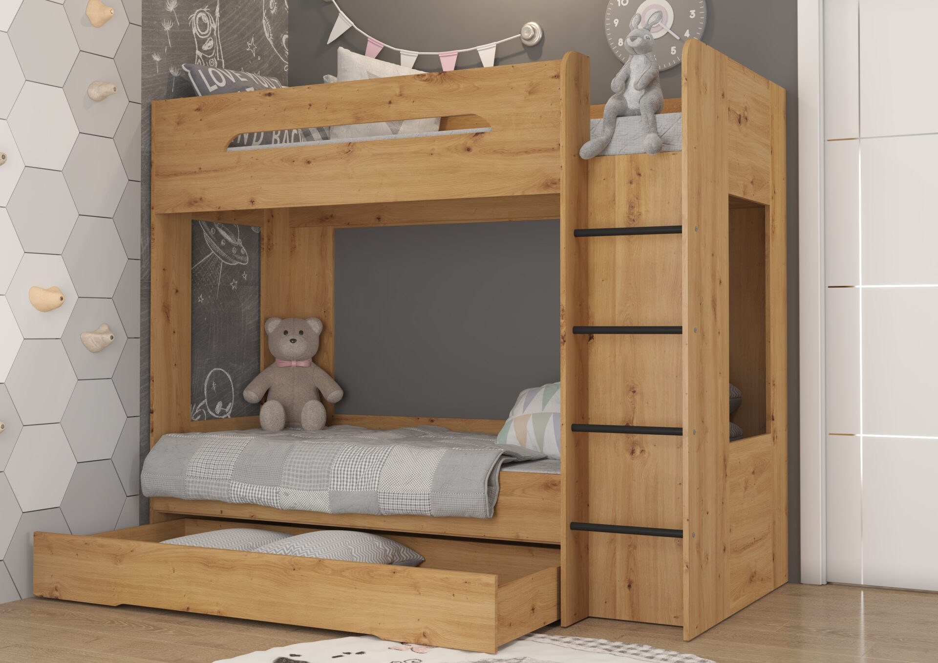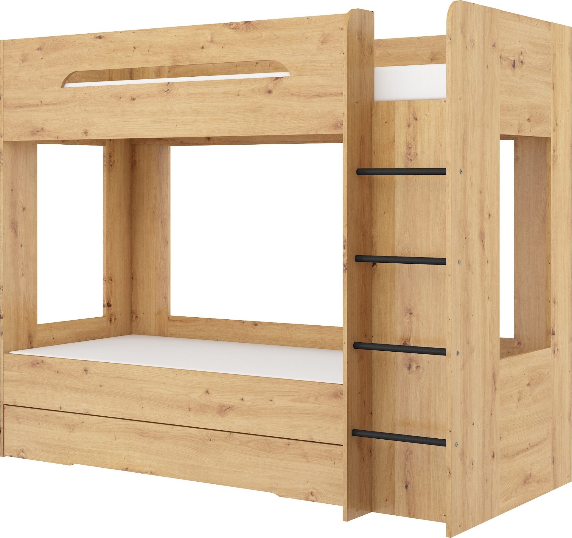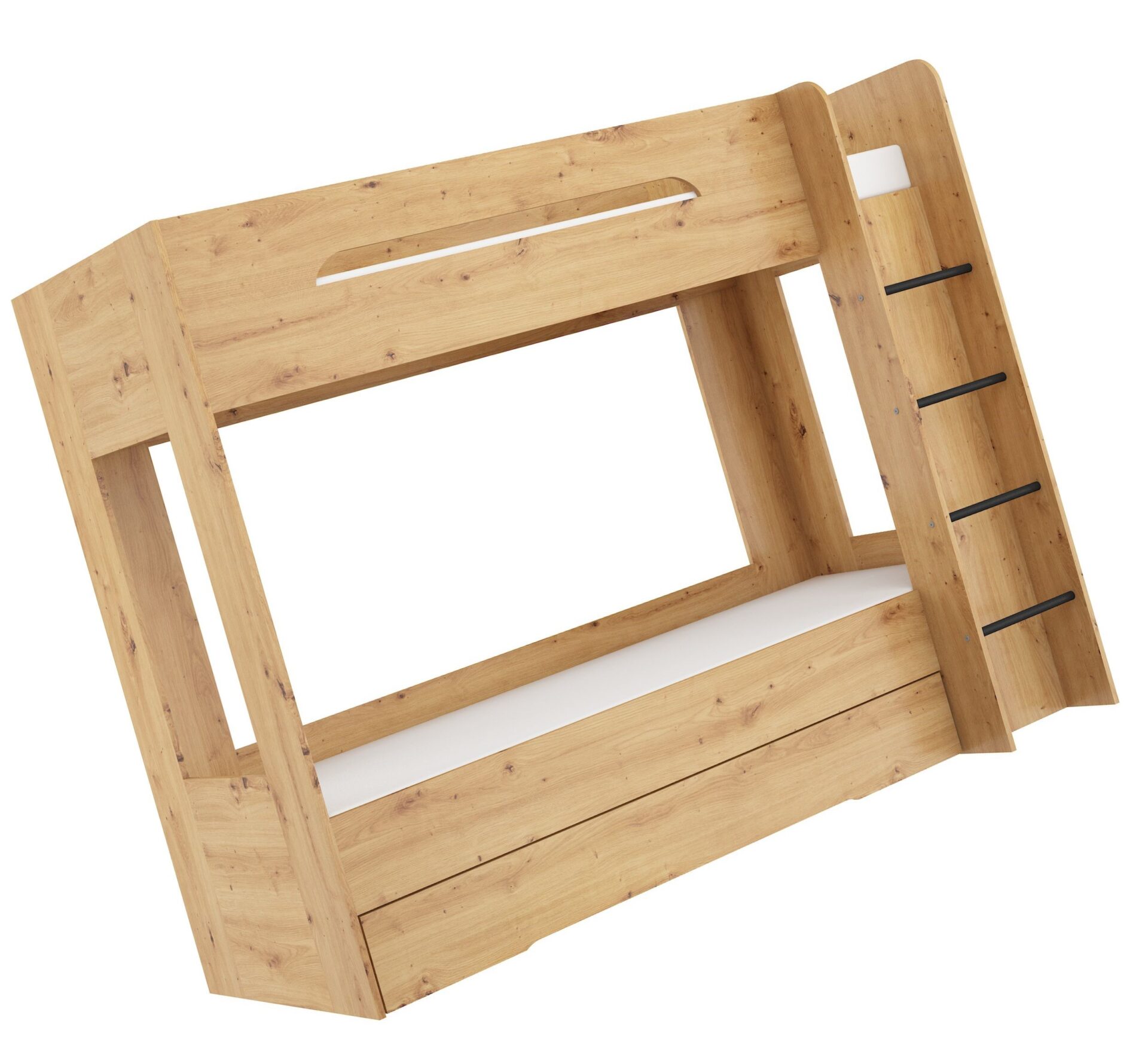 BLIN dviaukštė lova be čiužinio 80×200. 16 mm plokštė, ABS kraštas, maksimalus čiužinio aukštis 12 cm. Spalva: dirbtinis ąžuolas.