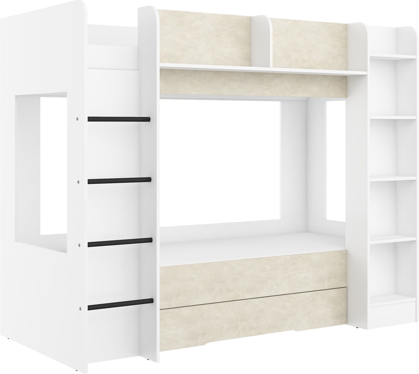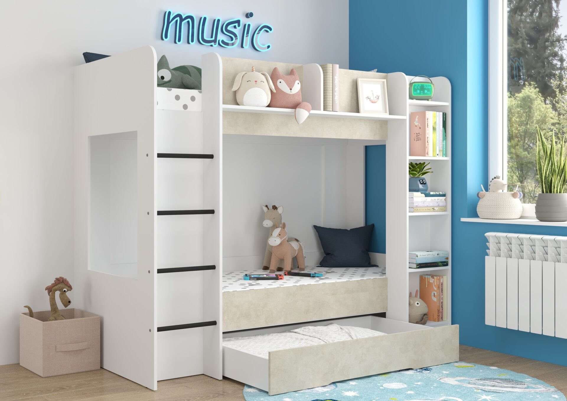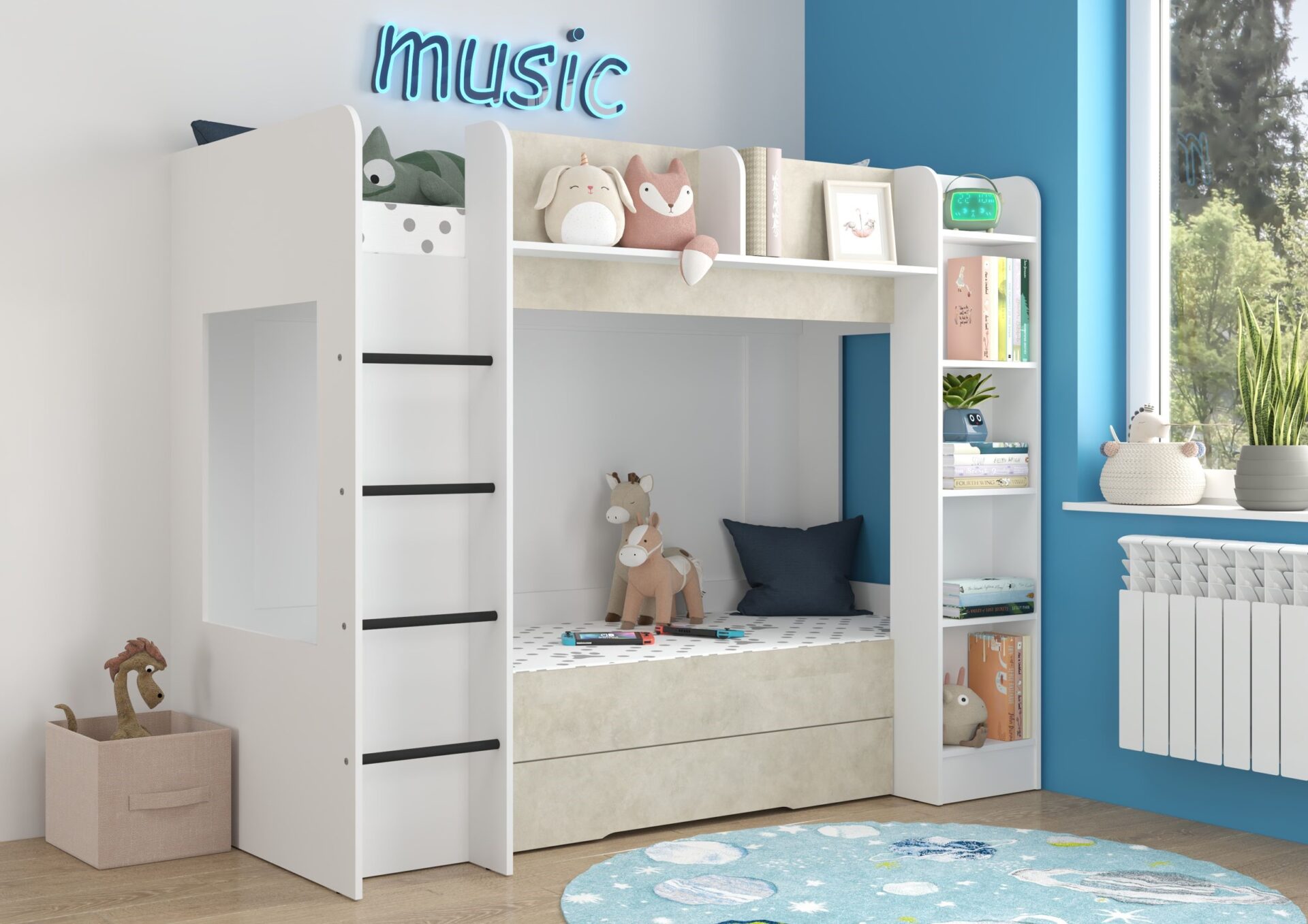 EVEST dviaukštė lova be čiužinio 80×200. 16 mm plokštė, ABS kraštas, maksimalus čiužinio aukštis 12 cm. Spalva: balta / granados migdolų.