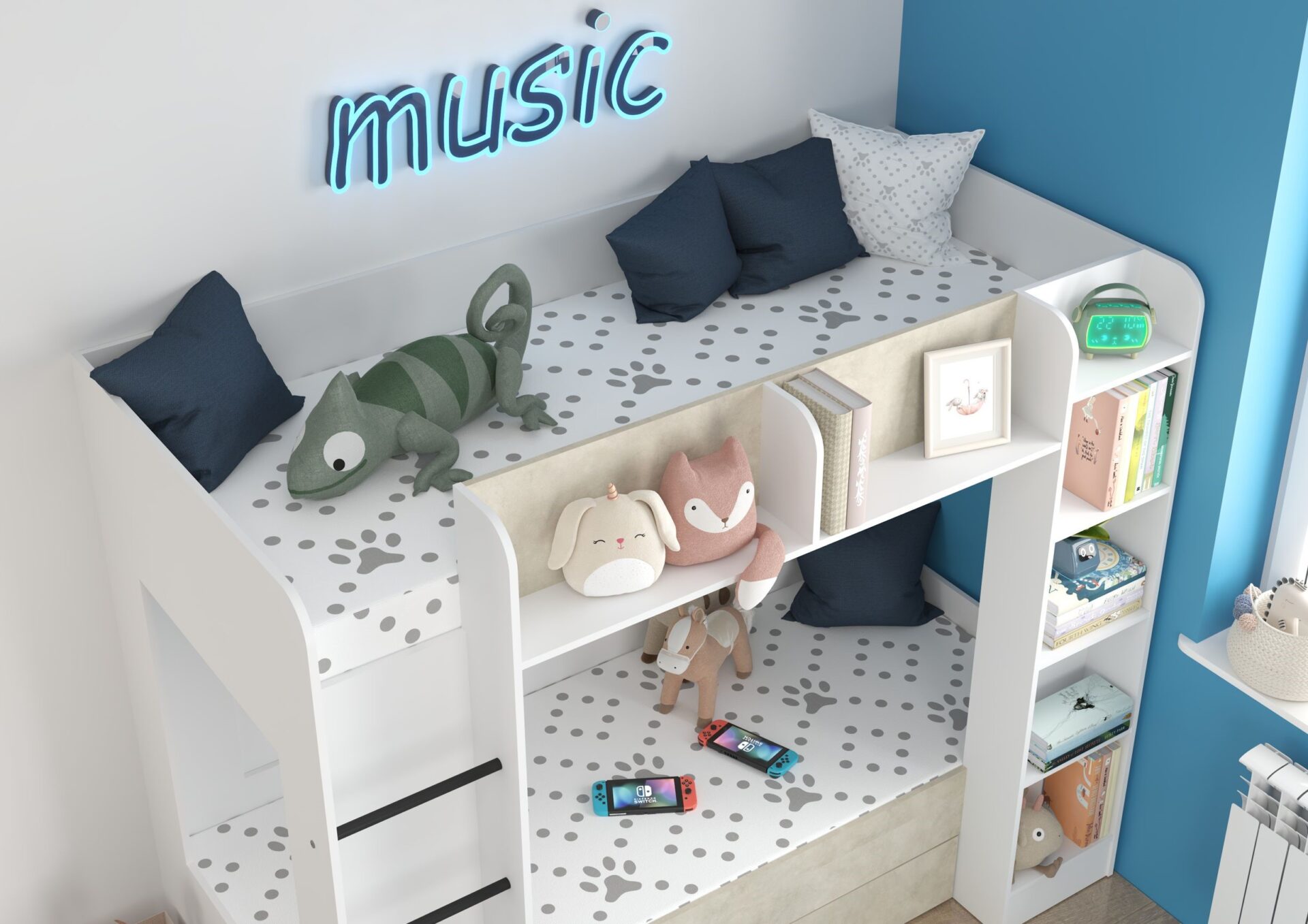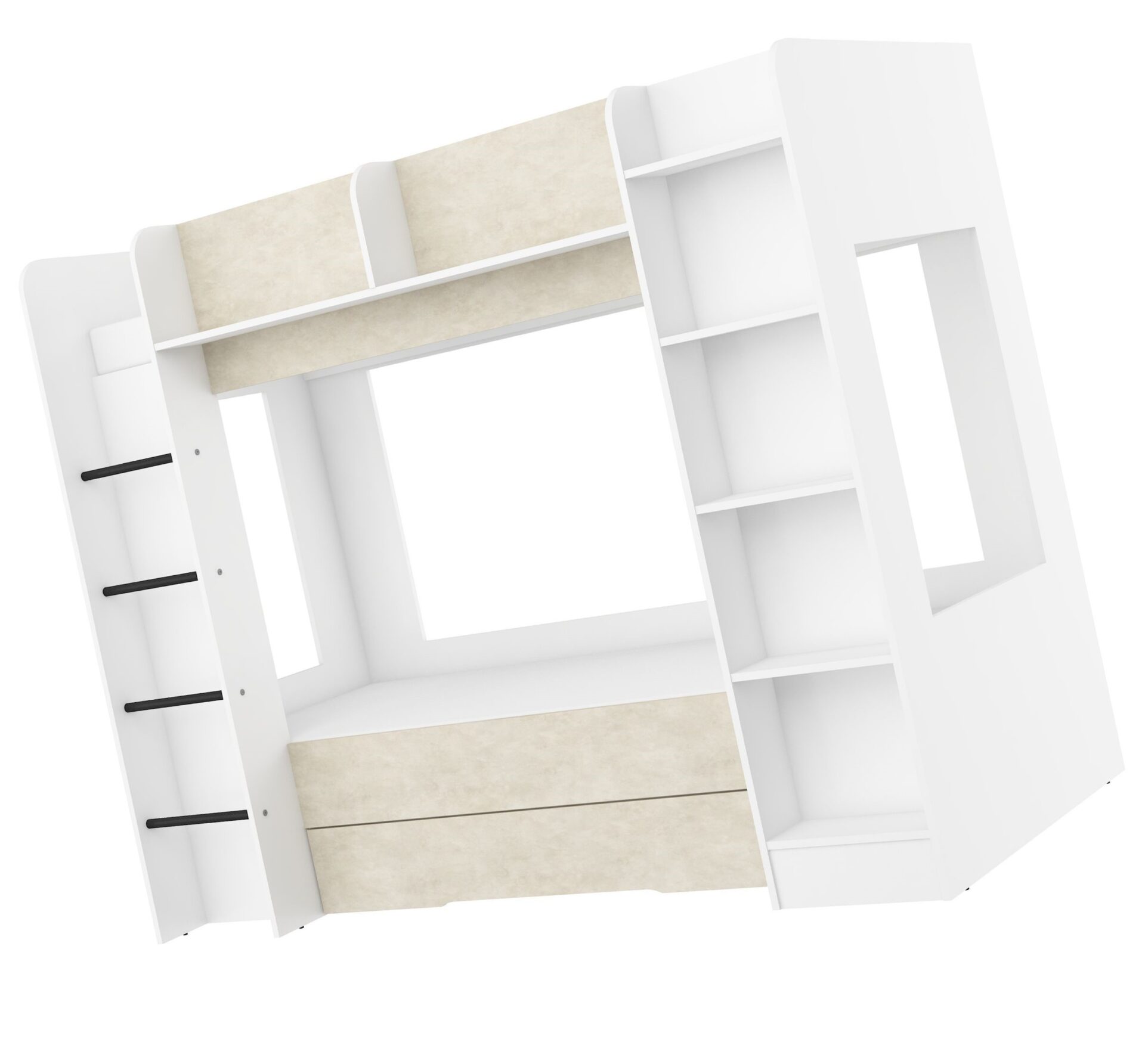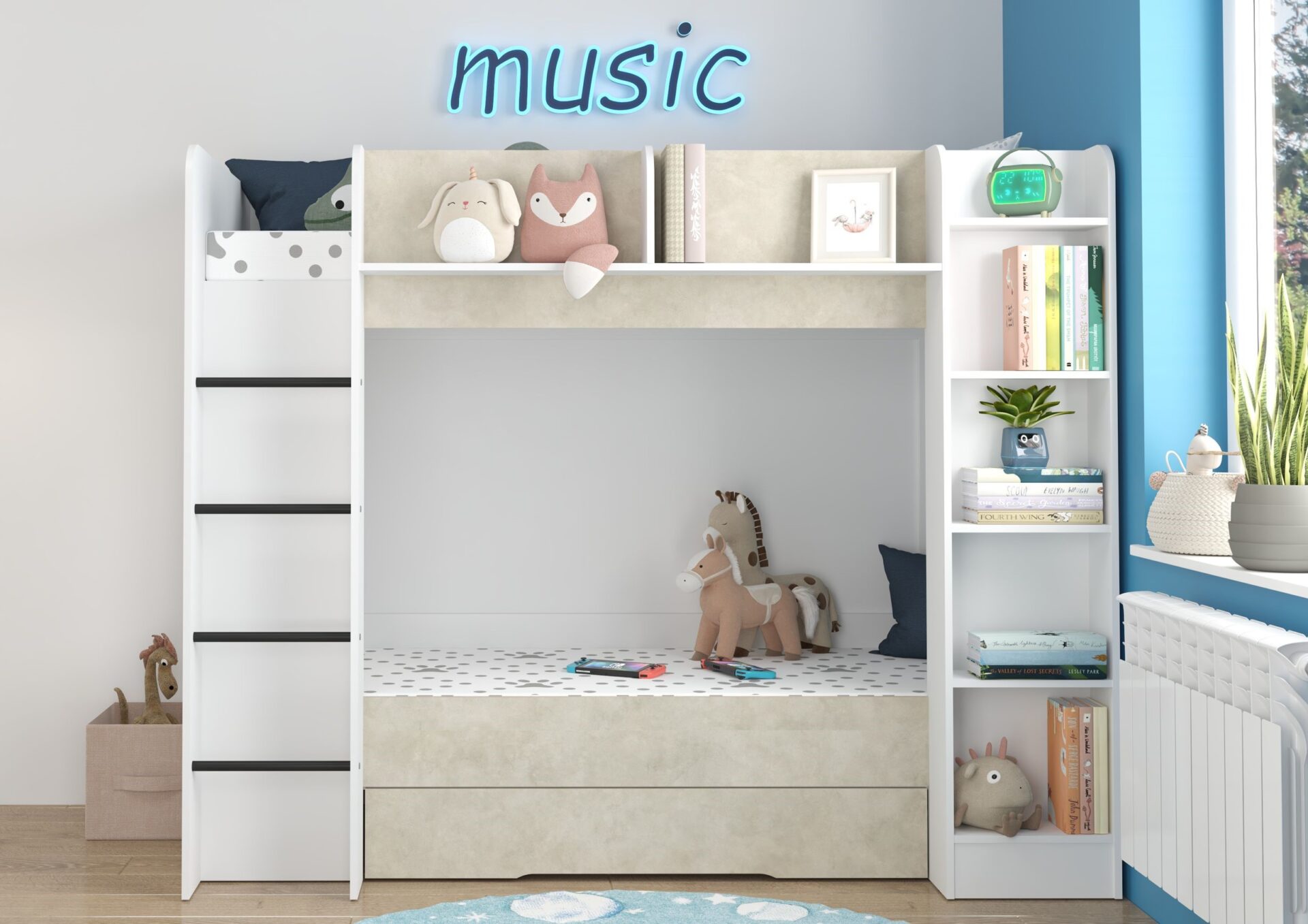 EVEST dviaukštė lova be čiužinio 80×200. 16 mm plokštė, ABS kraštas, maksimalus čiužinio aukštis 12 cm. Spalva: balta / granados migdolų.