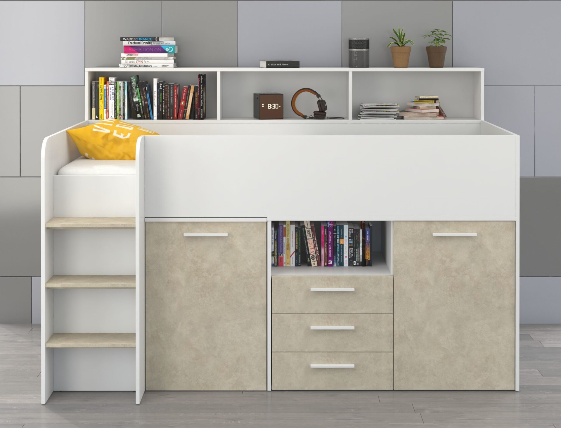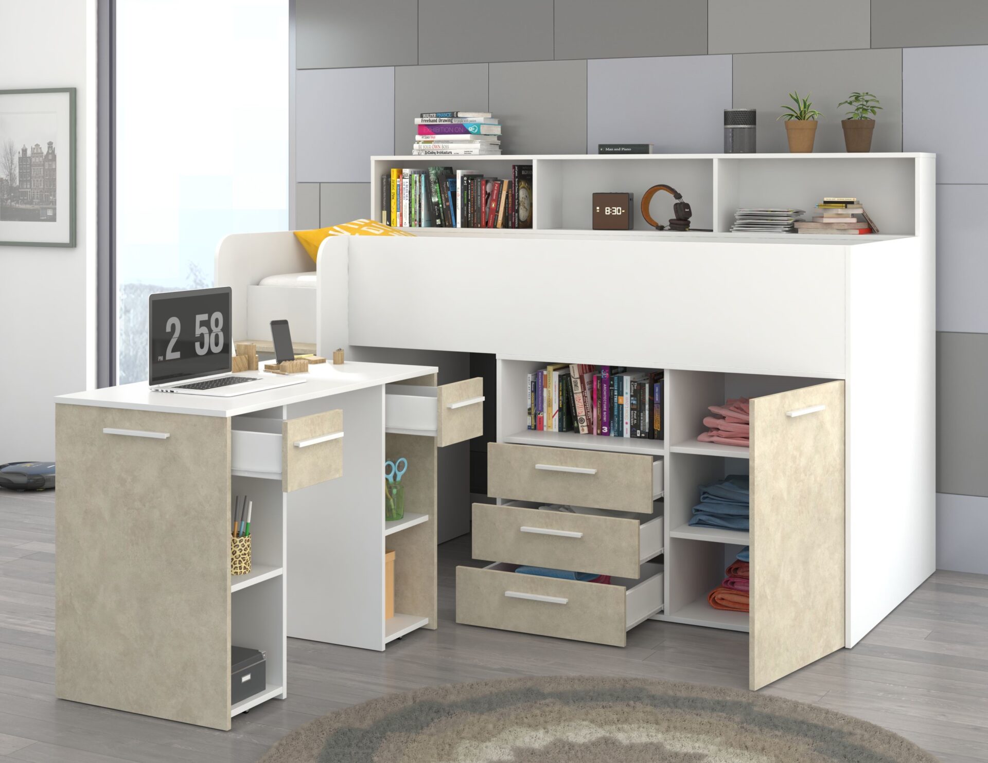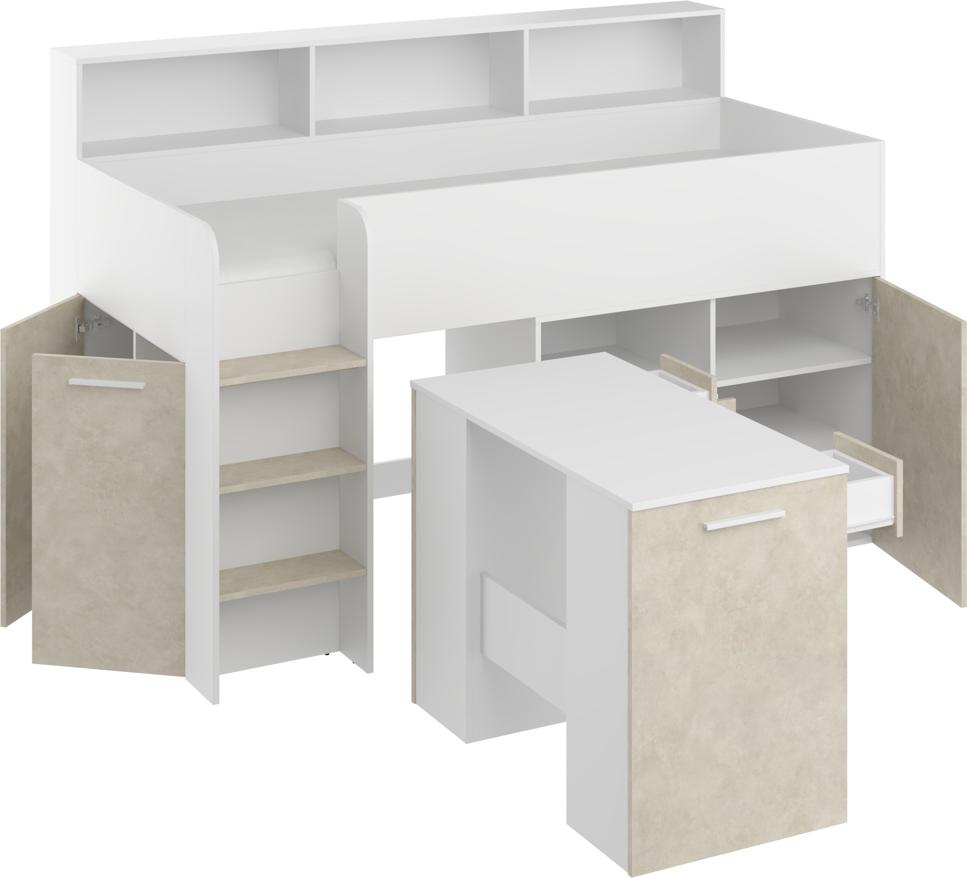 ENO L antresolė be čiužinio 80×200. 16 mm plokštė, ABS kraštas, švelnaus uždarymo mechanizmai stalčiuose ir spintelėse, maksimalus čiužinio aukštis 12 cm, spalva: balta / granados migdolų spalvos