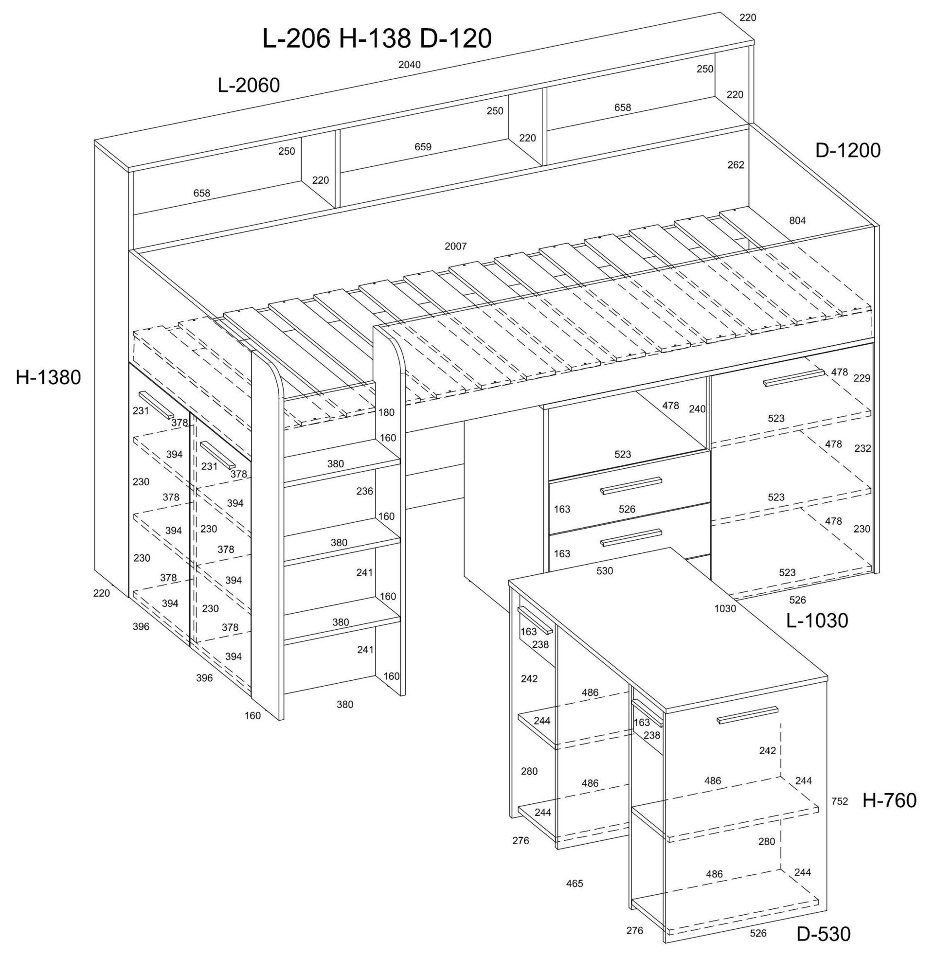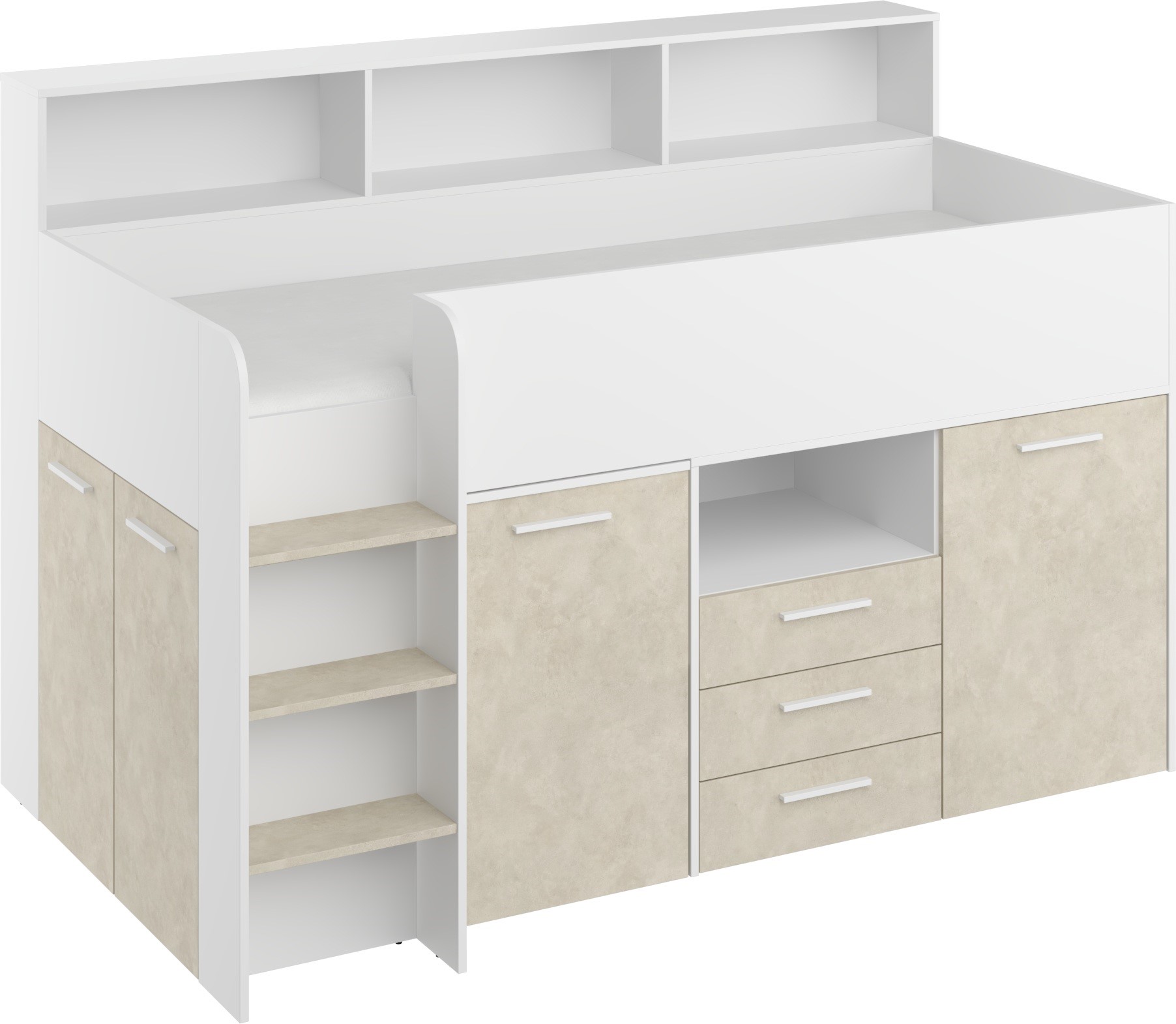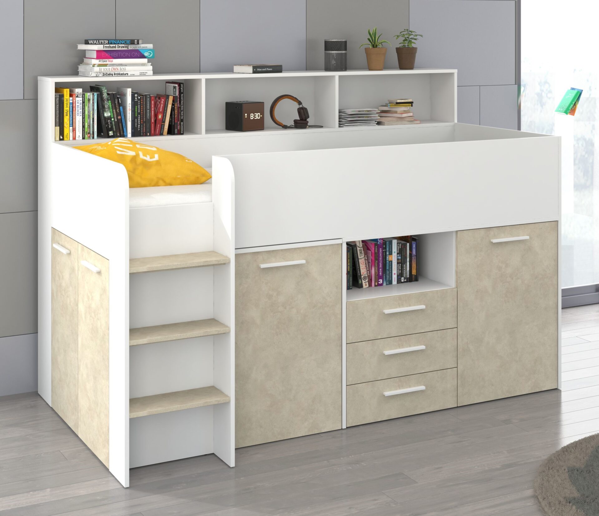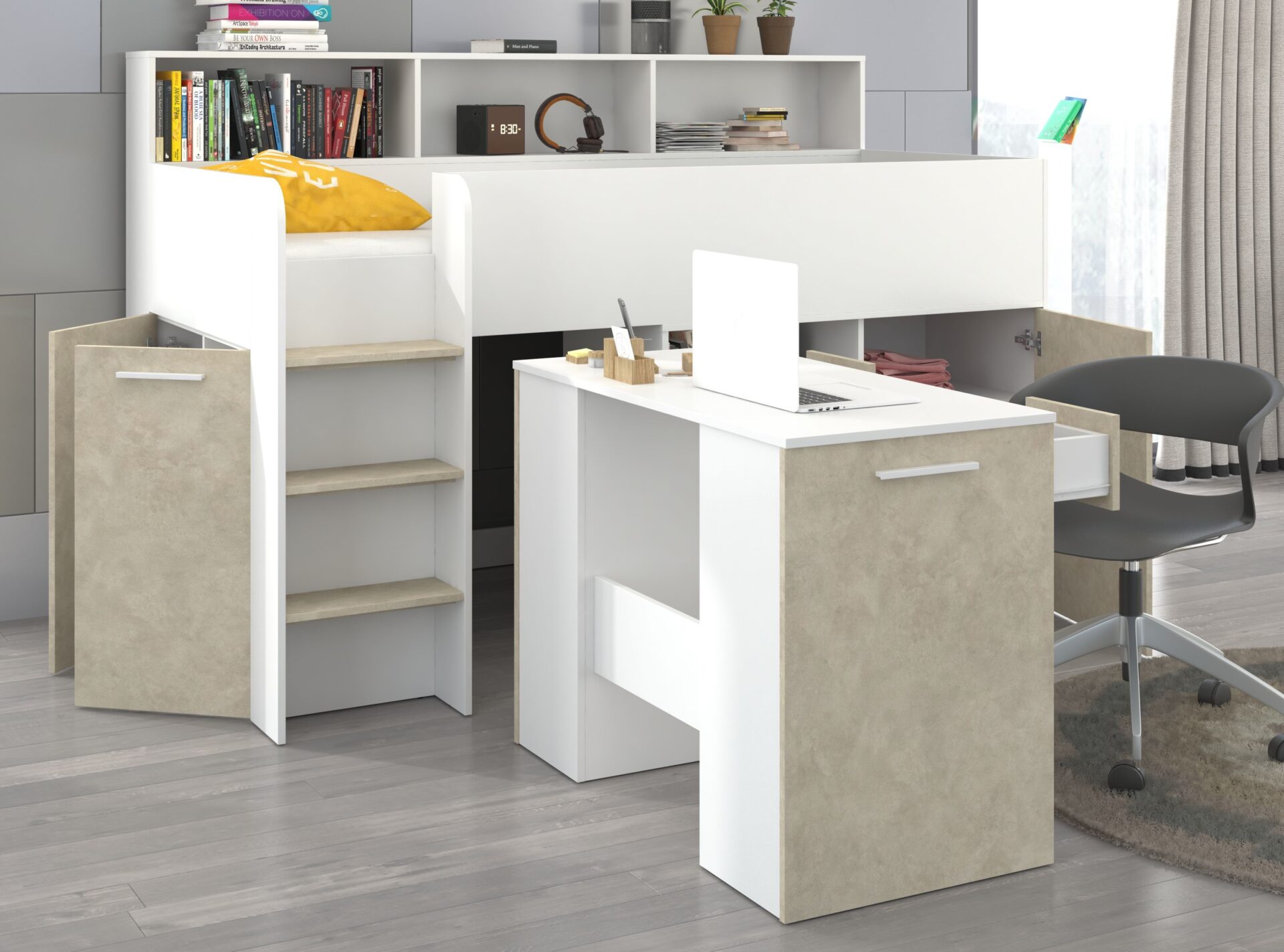 ENO L antresolė be čiužinio 80×200. 16 mm plokštė, ABS kraštas, švelnaus uždarymo mechanizmai stalčiuose ir spintelėse, maksimalus čiužinio aukštis 12 cm, spalva: balta / granados migdolų spalvos