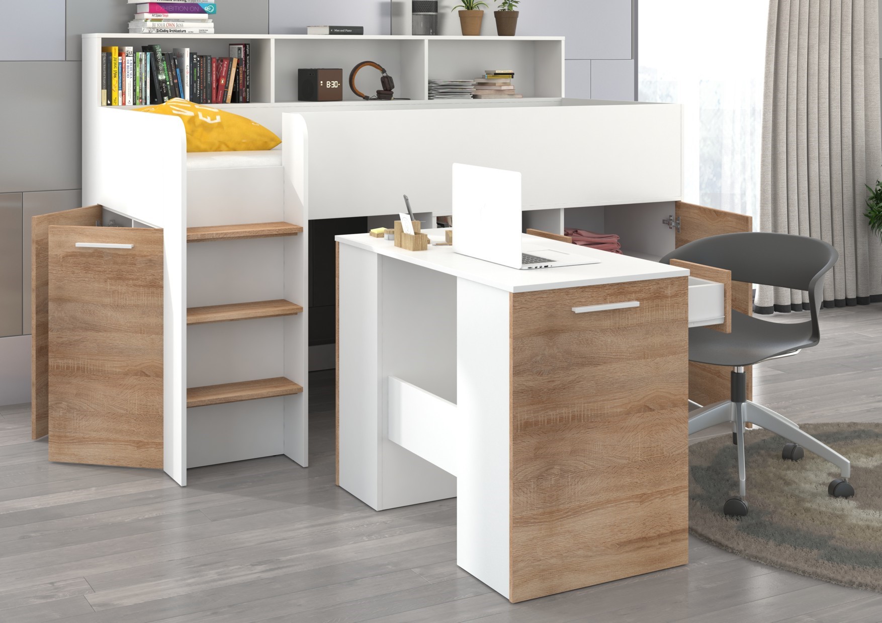 ENO L antresolė be čiužinio. 16 mm plokštė, ABS kraštas, švelnaus uždarymo mechanizmai stalčiuose ir spintelėse, maksimalus čiužinio aukštis 12 cm, spalva: balta / Sonoma ąžuolas