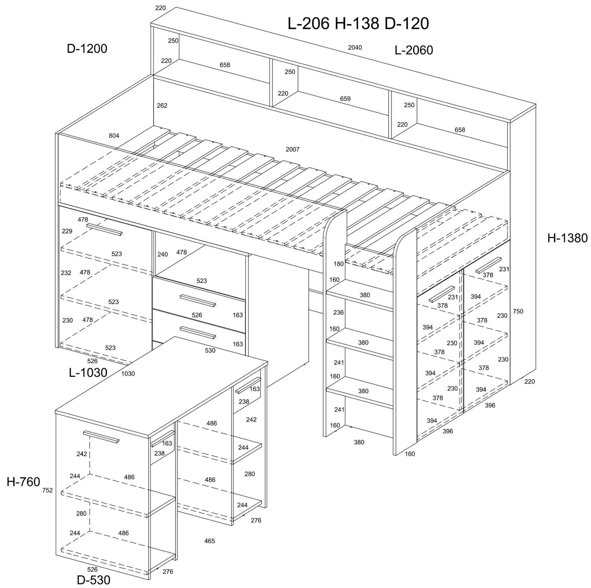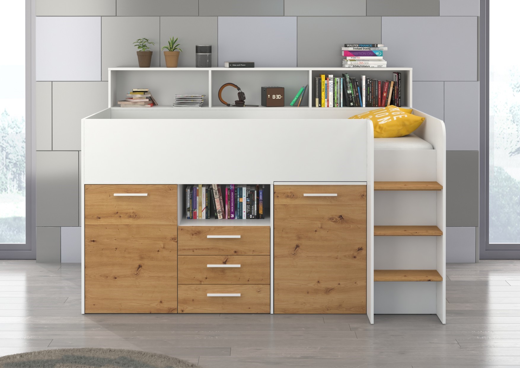 ENO P antresolė be čiužinio 80×200, 16 mm plokštė, ABS kraštas, švelnaus uždarymo mechanizmai stalčiuose ir spintelėse, maksimalus čiužinio aukštis 12 cm, spalva: balta / dirbtinis ąžuolas