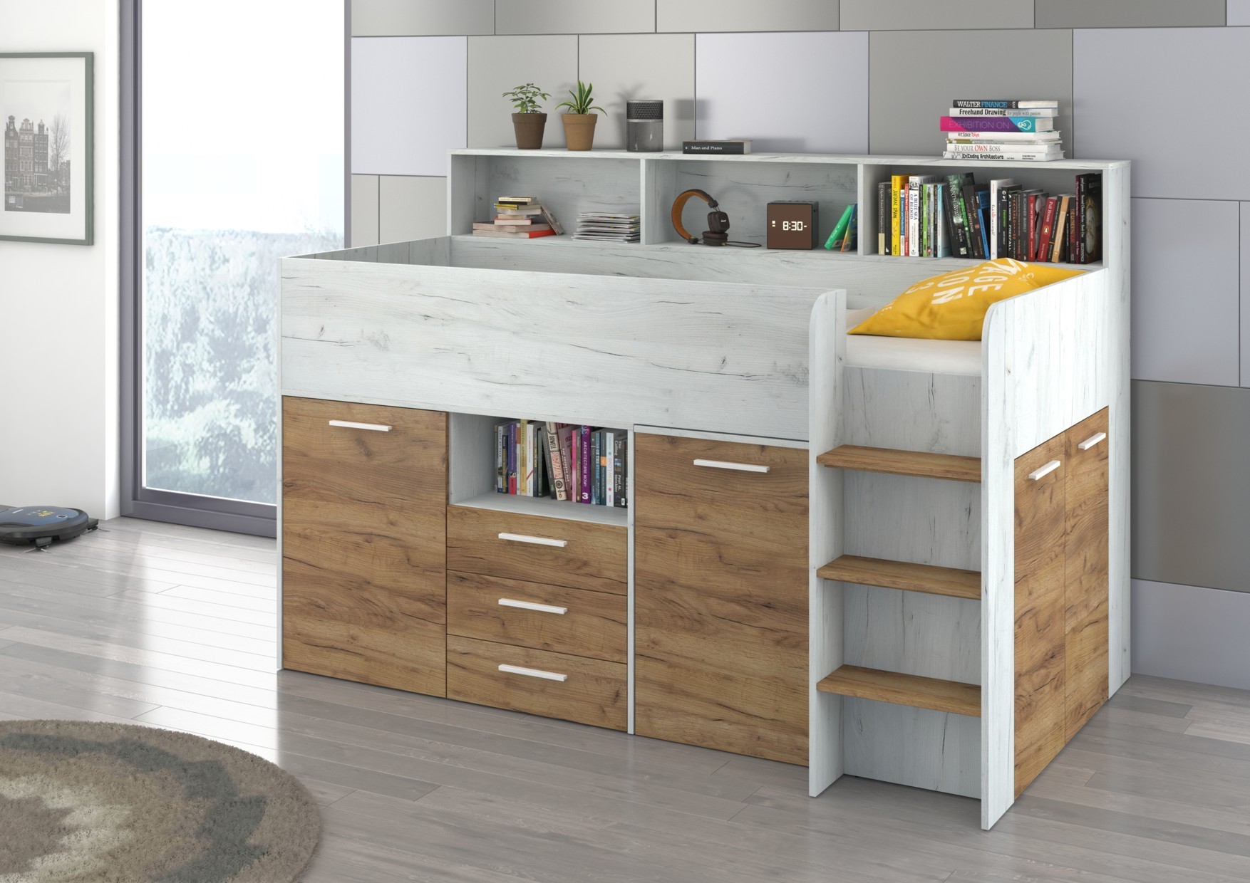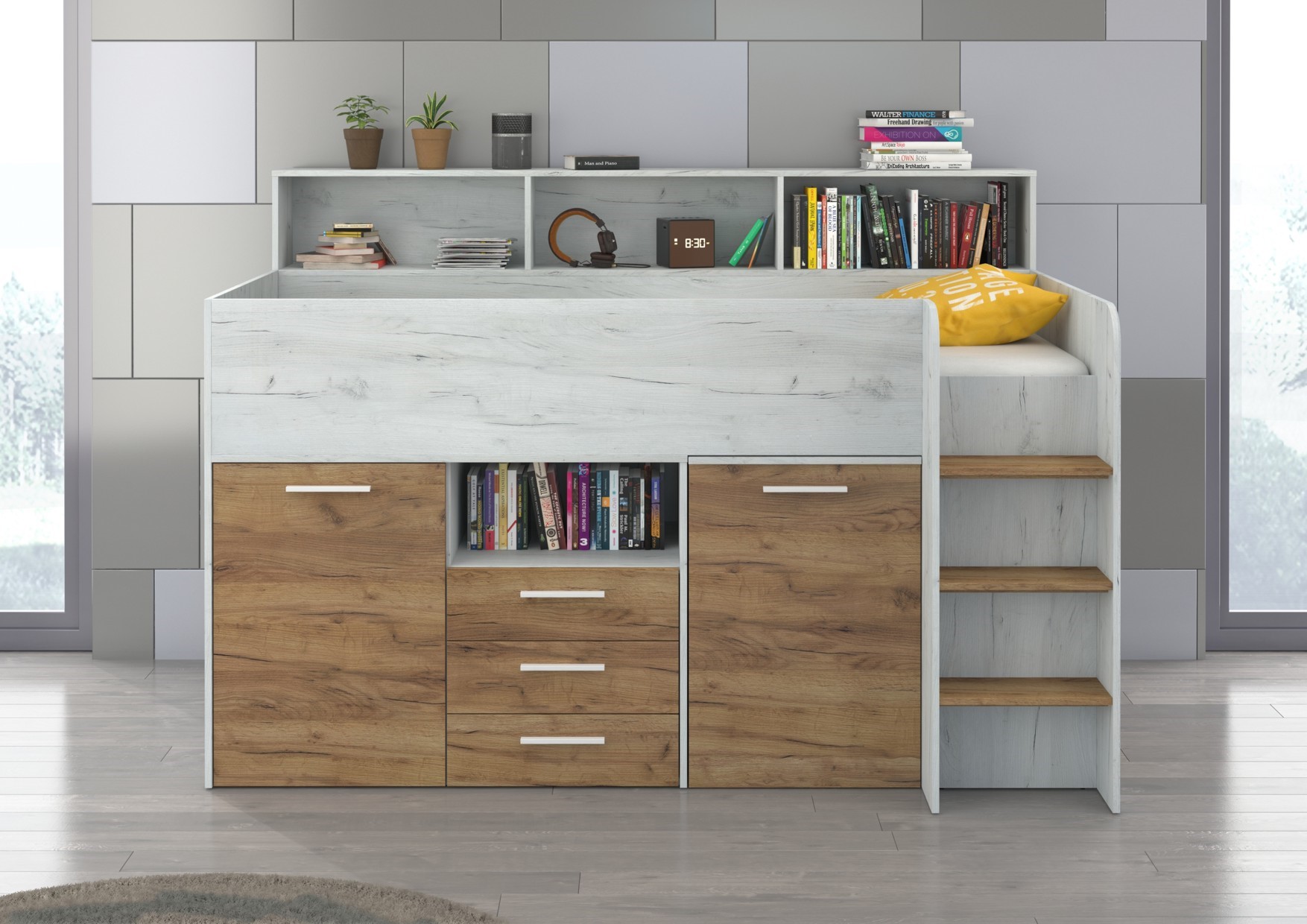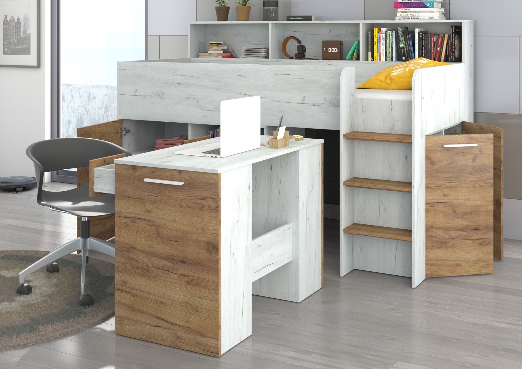 ENO P antresolė be čiužinio 80×200. 16 mm plokštė, ABS kraštas, švelnaus uždarymo mechanizmai stalčiuose ir spintelėse, maksimalus čiužinio aukštis 12 cm, spalvos: baltas ąžuolas / auksinis ąžuolas