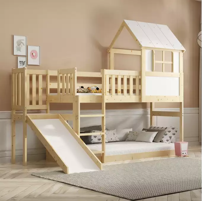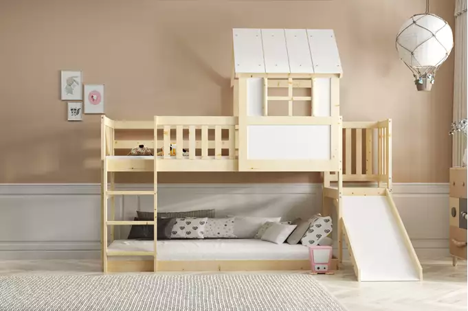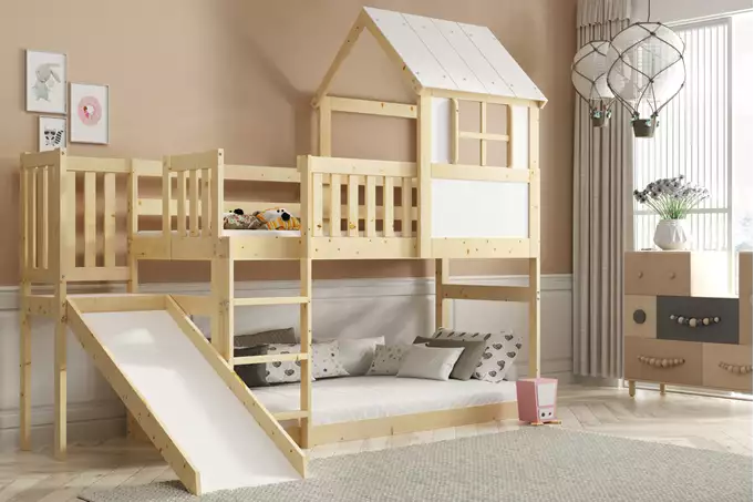 Dviaukštė lova su ištraukiama lova – antresolė, natūralaus medžio namelis 90×200 su čiužiniu