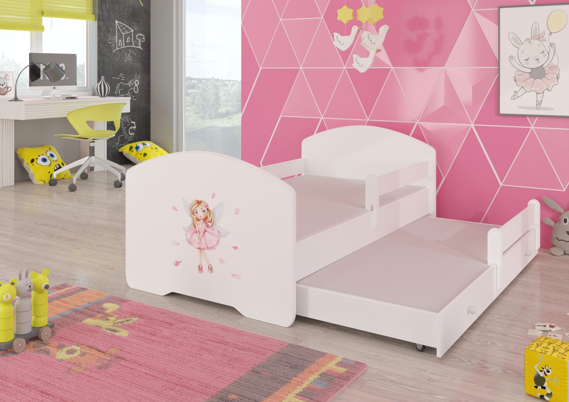 Ši paprastos formos dvigulė lova iš PEPE II kolekcijos turi stalčių su miegojimo funkcija, todėl puikiai tinka kambariui dviem broliams ir seserims. Ji taip pat idealiai tinka netikėtiems svečiams. Dėl plataus grafikos pasirinkimo lengvai rasite modelį, kuris geriausiai atitinka jūsų vaiko pomėgius. Gamybos procese naudojami ekologiški, vandens pagrindo dažai, todėl jie yra saugūs ir atsparūs mechaniniams pažeidimams. Be to, lova neturi aštrių kampų, o grafika yra laminuota. Papildomos savybės: apsauginis turėklas, užtikrinantis didesnį saugumą miegant, ir užtrauktuku užsegamas čiužinio užvalkalas, kurį lengva nuimti ir skalbti.