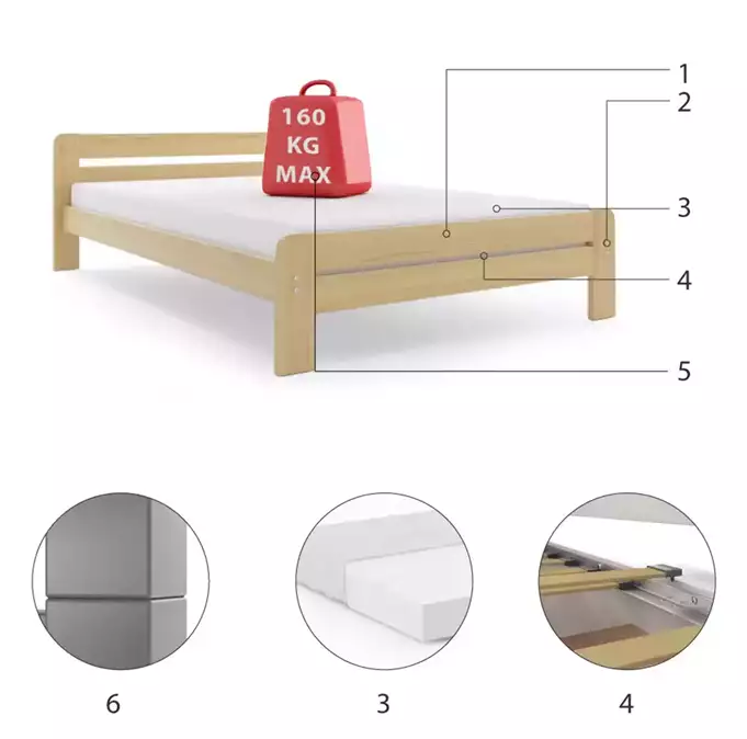 Lovos rėmas – pagamintas iš pušies medienos, dažytas vandens pagrindo laku. Surinkimo priedai – greitas ir paprastas surinkimas. Čiužinys: nėra. Rėmas – esame vienintelė įmonė, siūlanti rėmą iš spyruoklinių lentelių, pagamintą iš beržo medienos, tvirtinamą PVC rankena ant metalinės juostelės, su spragtelėjimo sistema (greitas surinkimas). Maksimali apkrova – 160 kg. Apvalinimas – spindulys R2.