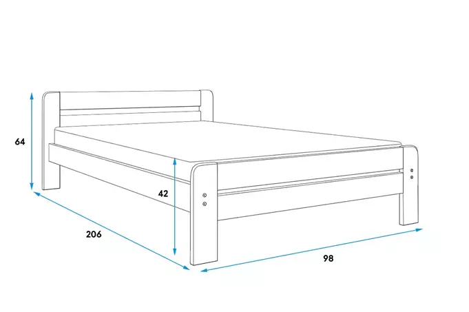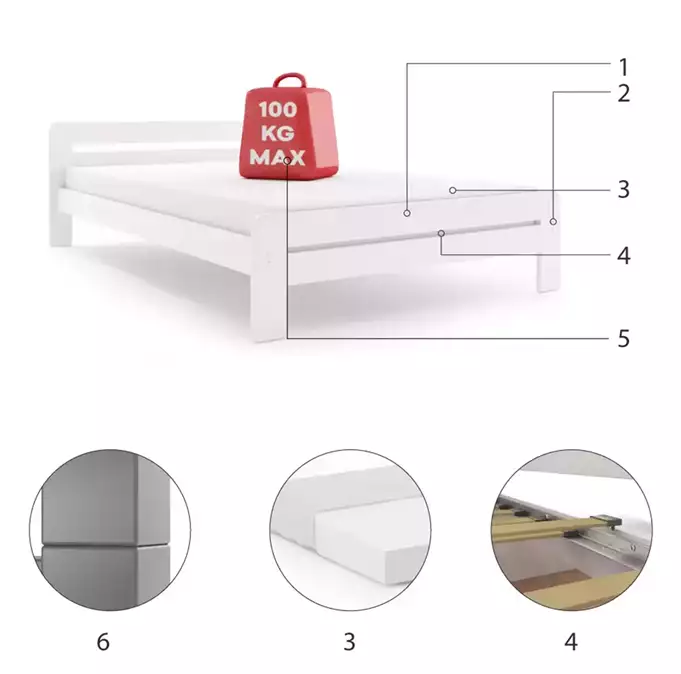 Lovos rėmas – pagamintas iš pušies medienos, dažytas vandens pagrindo laku. Surinkimo priedai – greitas ir paprastas surinkimas. Čiužinys – 200x90x9 dydžio, su nuimamu užvalkalu, oro kondicionavimo pluoštu ir poliuretano putomis. Užvalkalas – dygsniuotas hipoalerginis audinys, pagamintas iš poliesterio, su užtrauktuku. Rėmas – esame vienintelė įmonė, siūlanti rėmą iš spyruoklinių lentelių, pagamintų iš beržo medienos, tvirtinamų PVC laikikliu ant metalinės juostelės, su spragtelėjimo sistema (greitas surinkimas). Maksimali apkrova – 100 kg. Apvalinimo spindulys – R2.