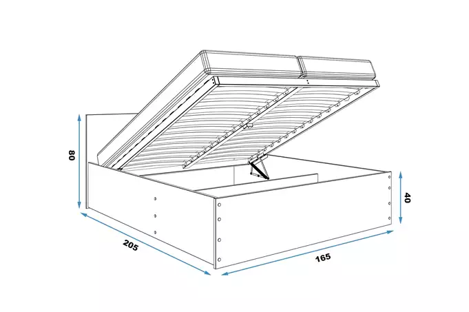 Konstrukcija pagaminta iš aukštos kokybės laminuotos plokštės, pasižyminčios patvarumu ir lengvu valymu. Galinė dalis po lova neturi dugno plokštės, todėl daiktadėžė yra tik lovos priekyje. Surinkimo priedai – greitas ir paprastas surinkimas. Rėmas – tvirtinamas ant dviejų metalinių spyruoklinių mechanizmų, sudarytų iš 30 tvirtų beržo lentelių, pritvirtintų prie medinės konstrukcijos. Čiužinys – matmenys 80x200x9 (2 vnt.), su nuimamu užvalkalu, oro kondicionavimo pluoštu ir poliuretano putomis. Užvalkalas – dygsniuotas hipoalerginis poliesterio audinys, su užtrauktuku. Išlinkis – spindulys R2. Keliamoji galia – 400 kg.