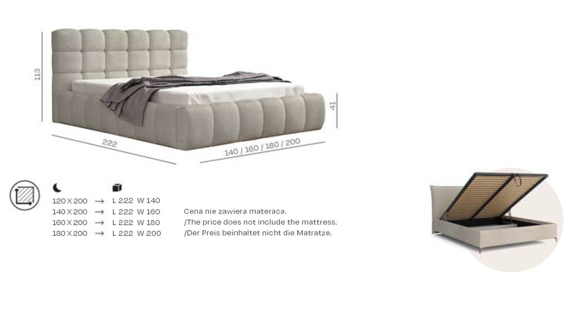 Išskirtinė minkšta „Dolce“ lova – tai baldas, kurio prabangi išvaizda suteiks bet kuriam miegamajam unikalaus žavesio, o dėl joje esančios dėtuvės ji palaikys tvarką ir tvarką kambaryje.