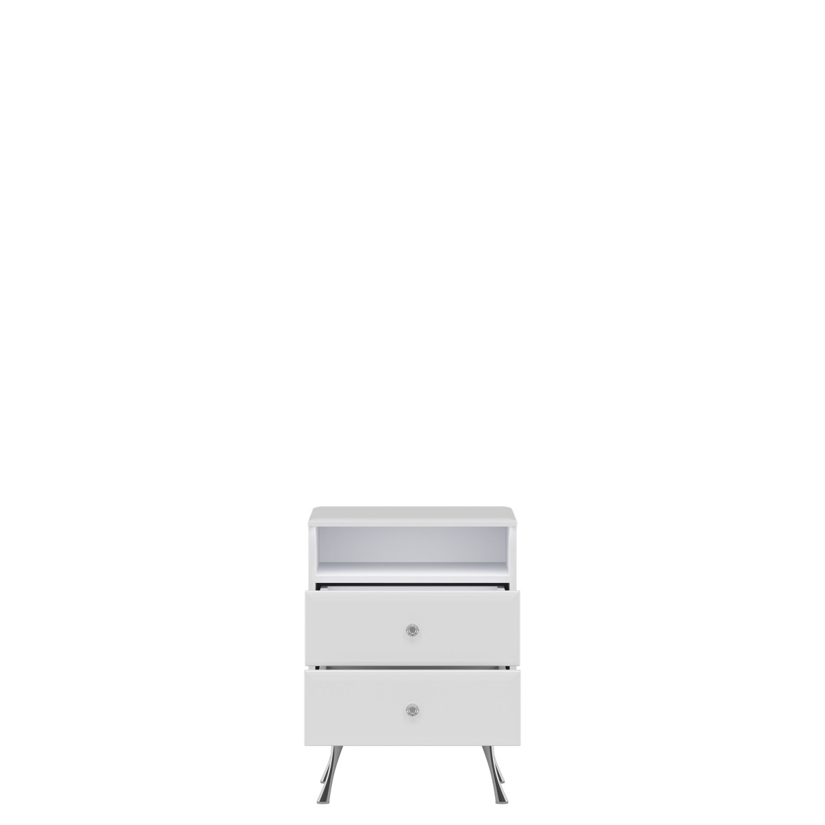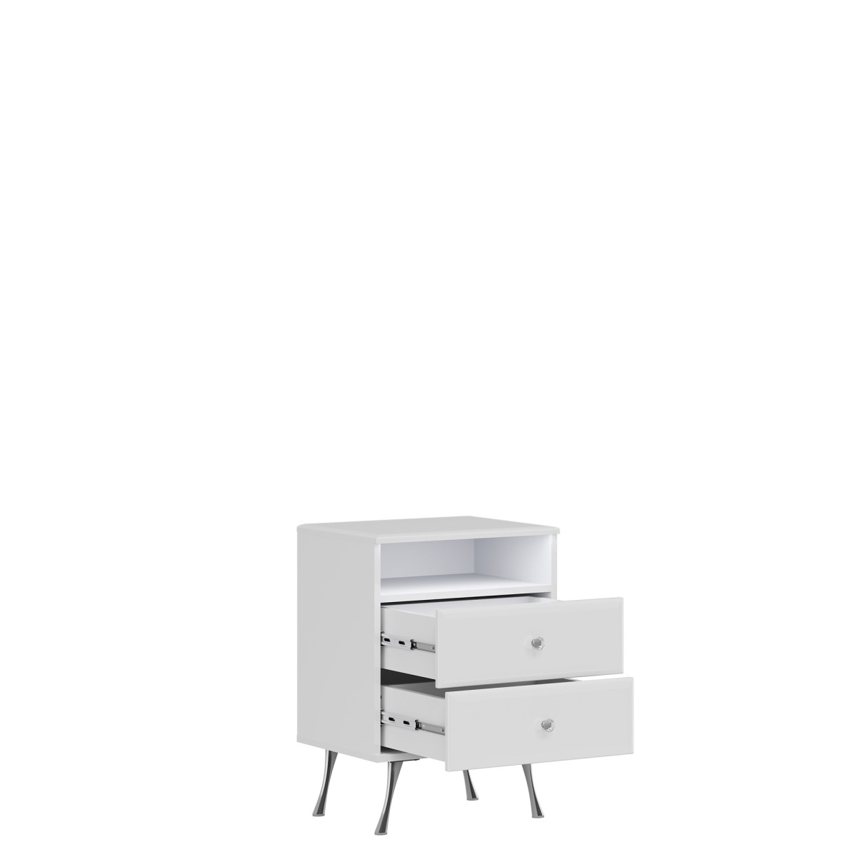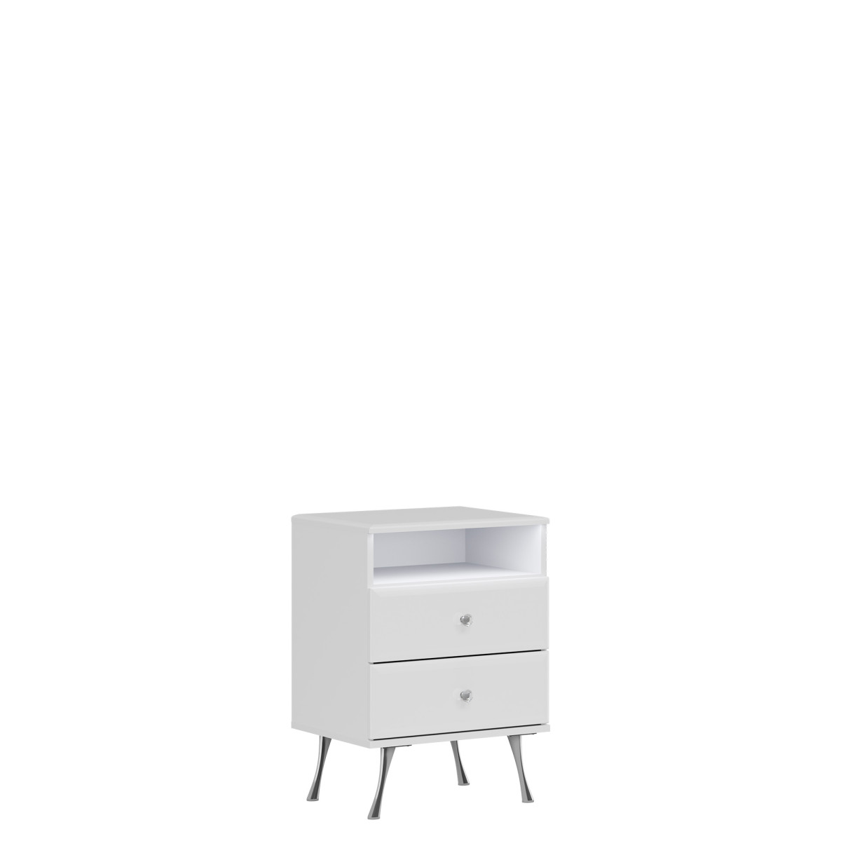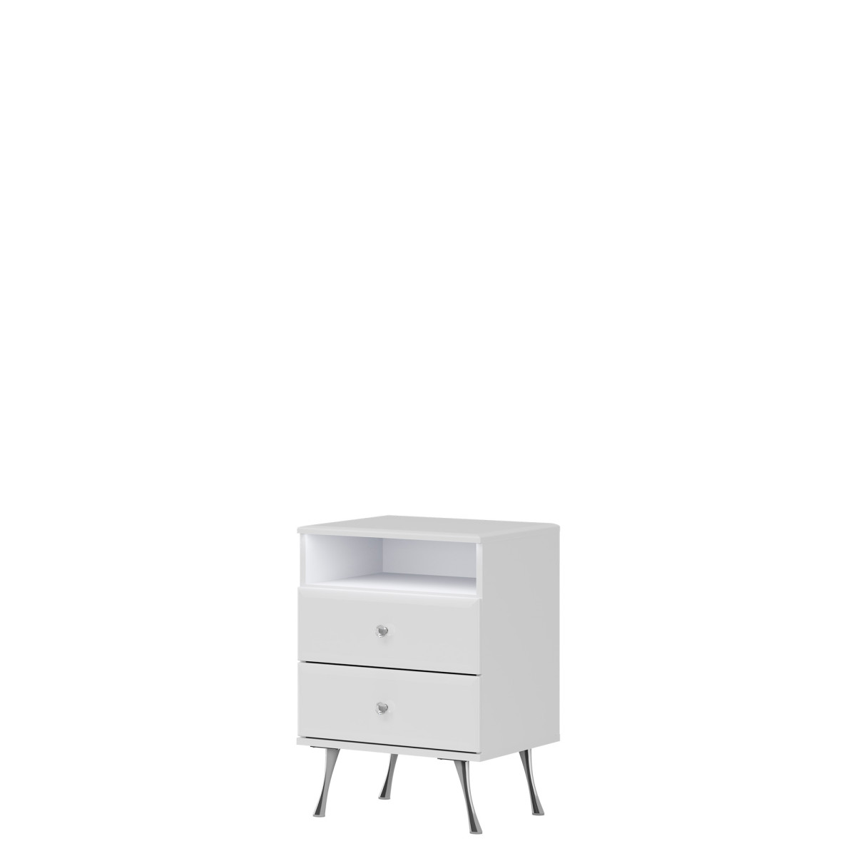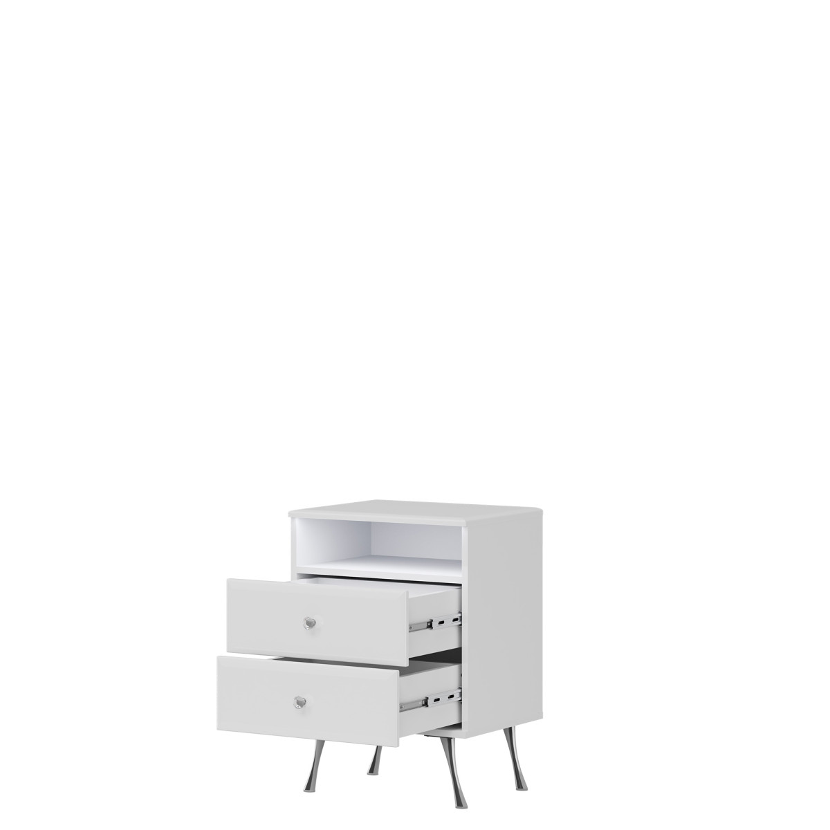 Šis elegantiškas naktinis staliukas – tai tobulas modernaus dizaino ir subtilaus žavesio derinys. Minimalistinę formą papildo išraiškingos detalės, suteikiančios baldui unikalų charakterį. Blizgus baltas fasadų paviršius harmoningai dera su chromuotomis kojelėmis, kurios traukia akį lengva, švelniai išlenkta forma. Šis baldas yra ne tik praktiškas, bet ir stilingas bet kurio miegamojo akcentas. Du erdvūs stalčiai suteikia daug vietos būtiniausiems daiktams susidėti – nuo knygų prieš miegą iki kosmetikos ir elektroninių priedų. Jų sklandžiai apdailintas fasadus papildo dekoratyvinės rankenėlės su Sworowski kristalais, primenančiomis krištolo rankenėles, suteikiančios bendram dizainui subtilaus blizgesio ir elegancijos. Dėl gerai apgalvoto dizaino ir kruopštaus meistriškumo, naktinis staliukas yra ne tik estetiškai patrauklus, bet ir patvarus bei patogus naudoti. Šis baldas puikiai derės tiek prie modernaus, tiek prie klasikinio interjero, suteikdamas skoningą papildymą. Jis puikiai tinka ne tik kaip naktinis staliukas, bet ir kaip mažas šoninis staliukas svetainėje ar persirengimo kambaryje. Tai pasirinkimas tiems, kurie vertina rafinuotą dizainą, funkcionalumą ir aukščiausią gamybos kokybę.