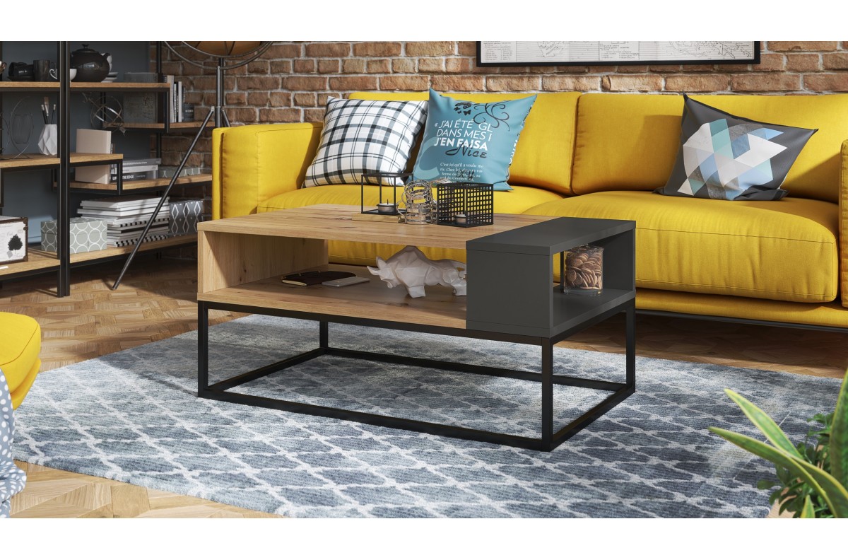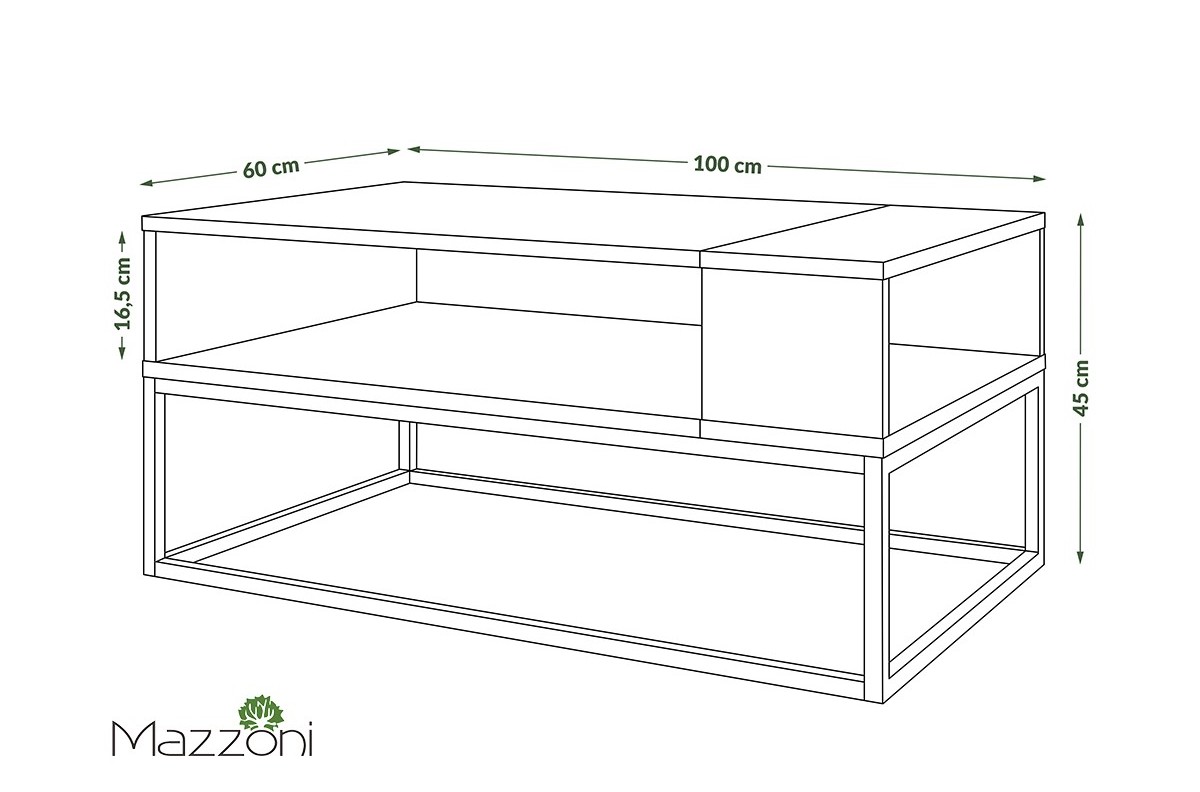 Kavos staliukas pagamintas iš 18 mm storio matinės medžio drožlių plokštės, laminuotos iš abiejų pusių. Visas gaminys apdailintas 1 mm ABS briauna. Papildomas elementas – juodai milteliniu būdu dažytas metalinis rėmas.