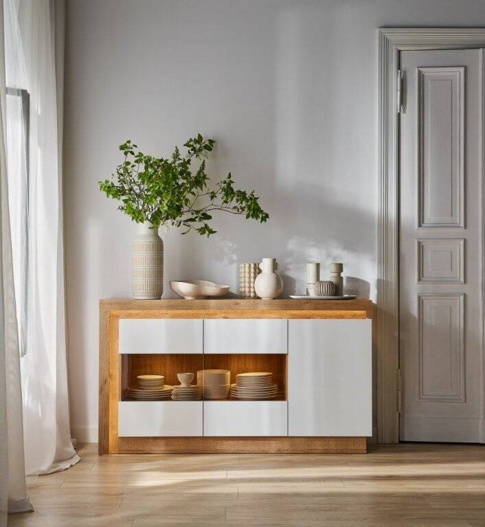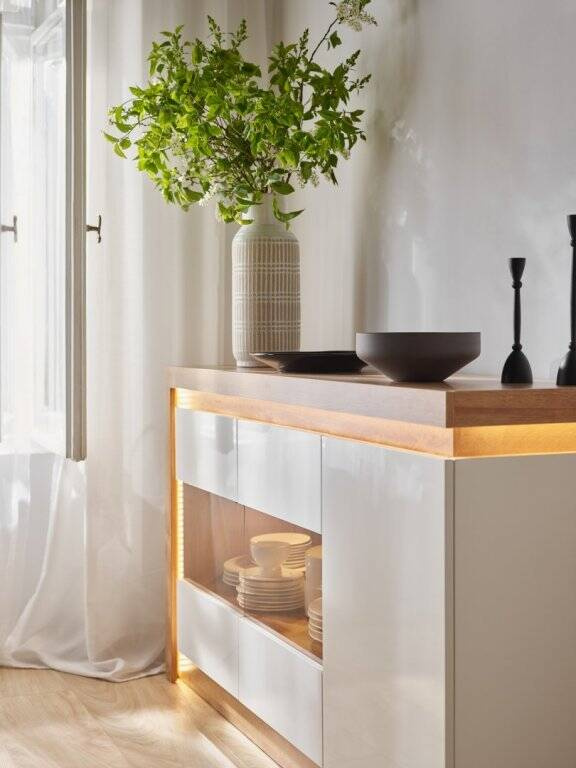 Leiskite man pristatyti nepaprastą funkcionalumo ir modernaus dizaino derinį viename balde – „Lyon LYOK02“ komodą šviesaus „Riviera Oak“ spalvos su baltais akcentais. Šis baldas meistriškai derina nesenstančią estetiką su novatoriškais sprendimais, sukurtais galvojant apie reikliausius vartotojus. Dėl savo matmenų (plotis: 157,6 cm, aukštis: 89,1 cm, gylis: 42 cm) ši komoda puikiai tiks jūsų svetainėje, miegamajame ar net prieškambaryje. Madinga „Lyon LYOK02“ komoda pagaminta iš aukštos kokybės laminuotos plokštės, kuri garantuoja atsparumą įbrėžimams, pažeidimams, drėgmei ir aukštai temperatūrai. Šios savybės užtikrina, kad komoda LYOK02 tarnaus ilgus metus, išlaikant aukščiausios kokybės estetines savybes. Komodos viršus yra patvarus ir puikiai tinka šeimos nuotraukoms, gėlių vazoms ar kitiems dekoratyviniams akcentams eksponuoti. Komoda LYOK02 turi tris duris – vienas pilnas ir dvi dalinai įstiklintas – ir turi sistemą be rankenėlių, kuri pabrėžia jos modernų charakterį. Durys turi švelniai užsidarančius vyrius, o stalčiai – bėgelius, kurie leidžia patogiai ir be triukšmo naudotis. Komplekte taip pat yra integruotas LED blykstės apšvietimas, kuris subtiliai išryškina komodos ypatybes ir sukuria unikalią atmosferą kambaryje.