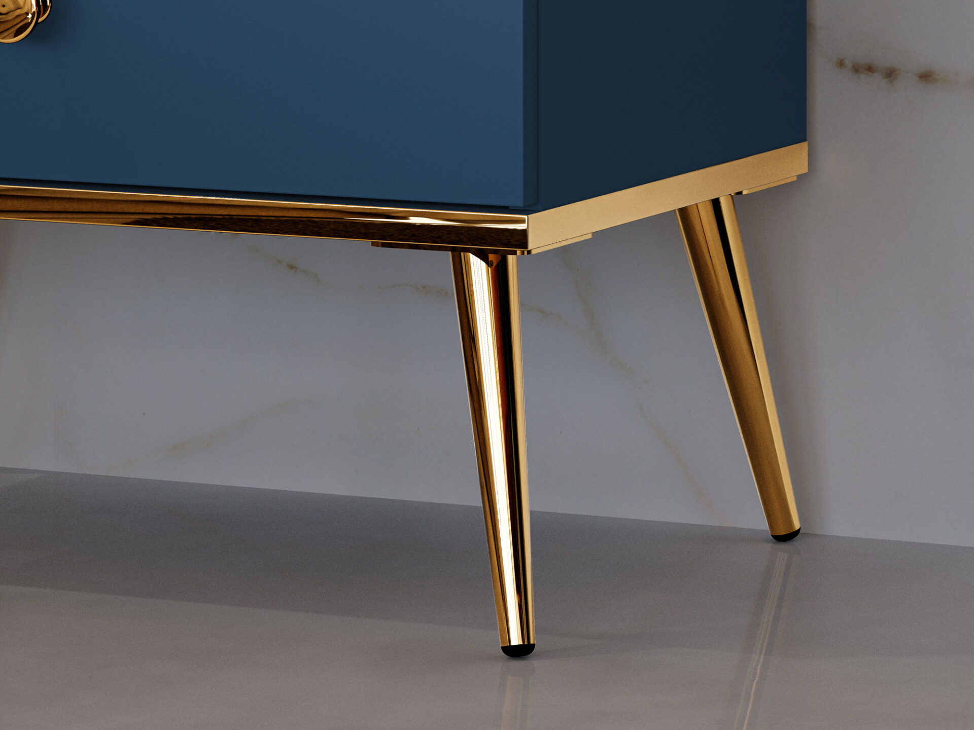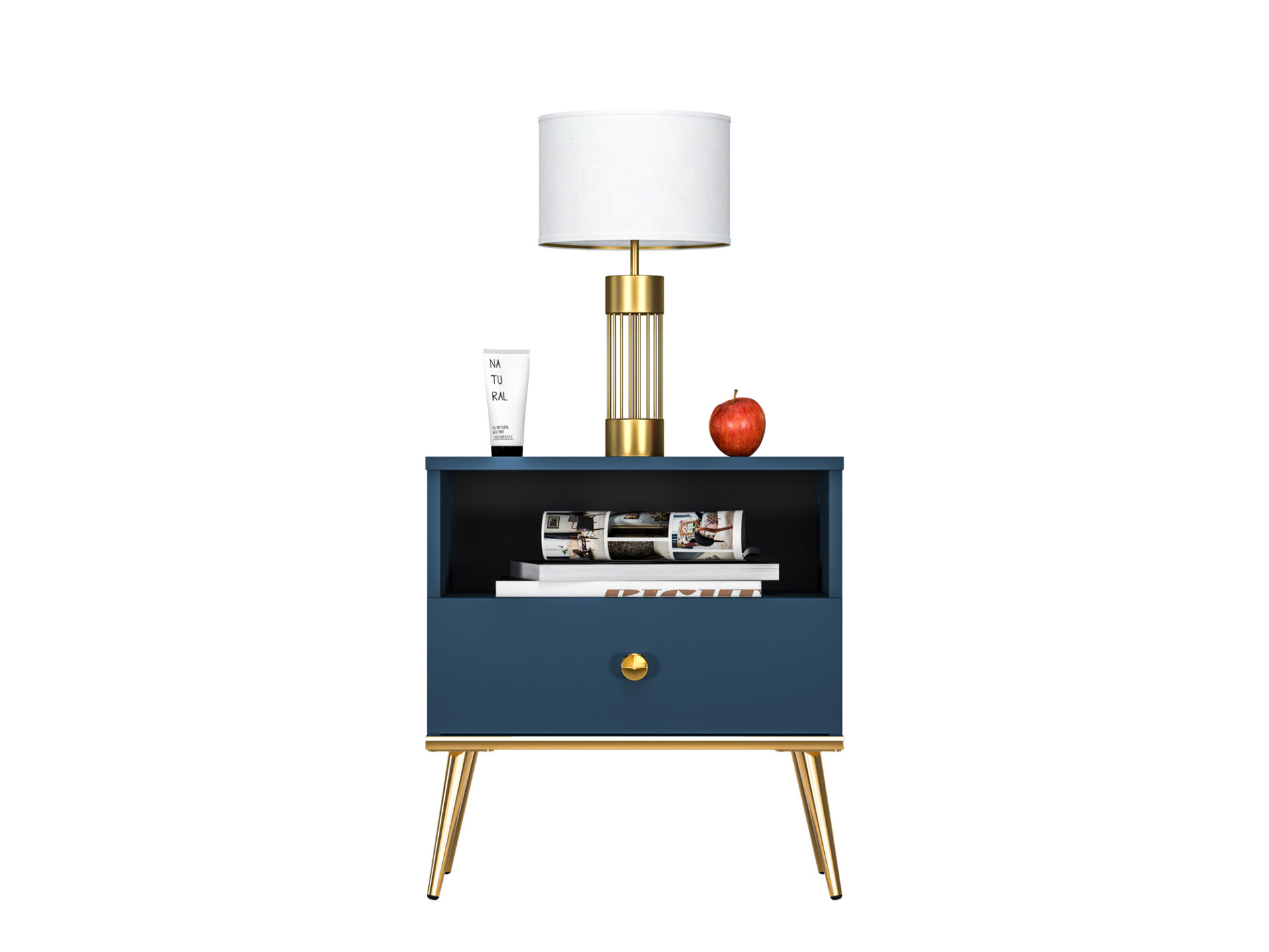 „Marine 06“ naktinis staliukas – tobulas baldas šiuolaikiškam miegamajam. Tvirtas stalviršis puikiai tinka naktinei lempai. Ant jo galite pastatyti stiklinę vandens arba padėti miegojimo knygą. Atvira lentyna puikiai tinka laikraščiams, žurnalams ar kitiems daiktams, kuriuos norite turėti po ranka, laikyti. Kompaktiškame stalčiuje tilps žvakės, rankų kremas ir plaukų šepetys. Visiems „Marine“ kolekcijos baldams būdinga sodri, tamsiai mėlyna apdaila. Rankenos, kojelės ir apatinės plokštės fanera, dėl savo klasikinės auksinės spalvos, pabrėžia elegantišką ir nesenstantį „Marine“ baldų charakterį.