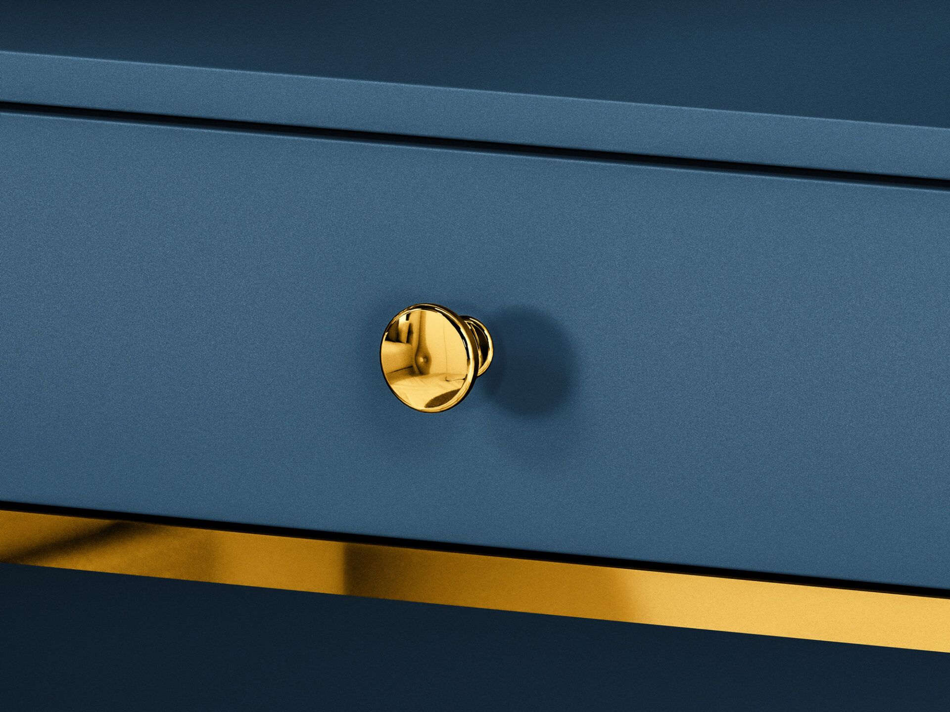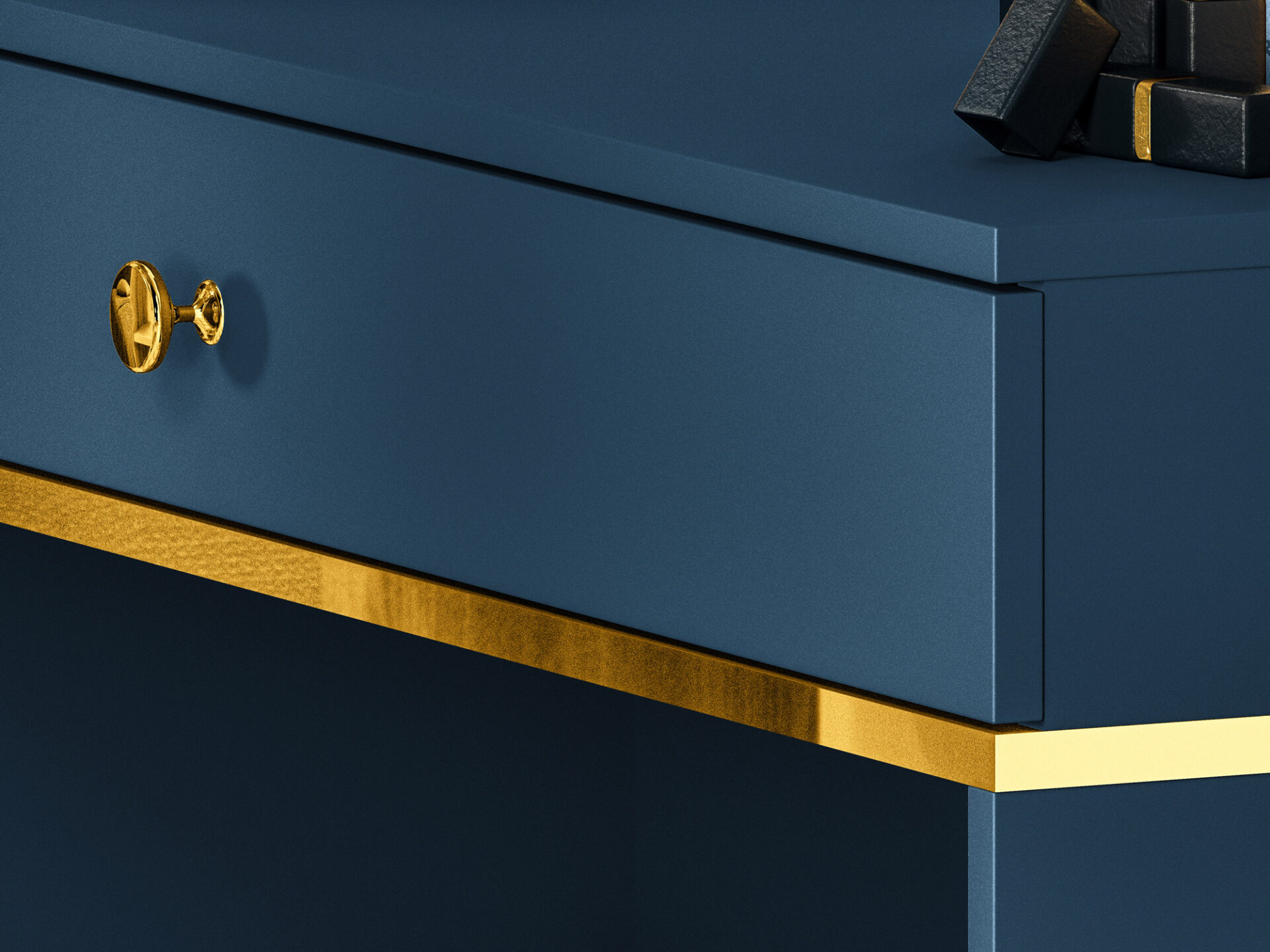 „Marine 09“ tualetinis staliukas puikiai papildys jūsų miegamąjį. Didelis stalviršis leidžia jums pademonstruoti savo kvepalų kolekciją ir laikyti makiažą. Jei pageidaujate minimalistinės tvarkos, visą kosmetiką galite laikyti erdviame stalčiuje, o stalviršis gali būti naudojamas kaip vieta, pavyzdžiui, vazai su mėgstamomis gėlėmis padėti. Visiems „Marine“ kolekcijos baldams būdinga sodri, tamsiai mėlyna apdaila. Rankenos ir apatinės plokštės fanera, dėl savo klasikinės auksinės spalvos, pabrėžia elegantišką ir nesenstantį „Marine“ baldų charakterį.