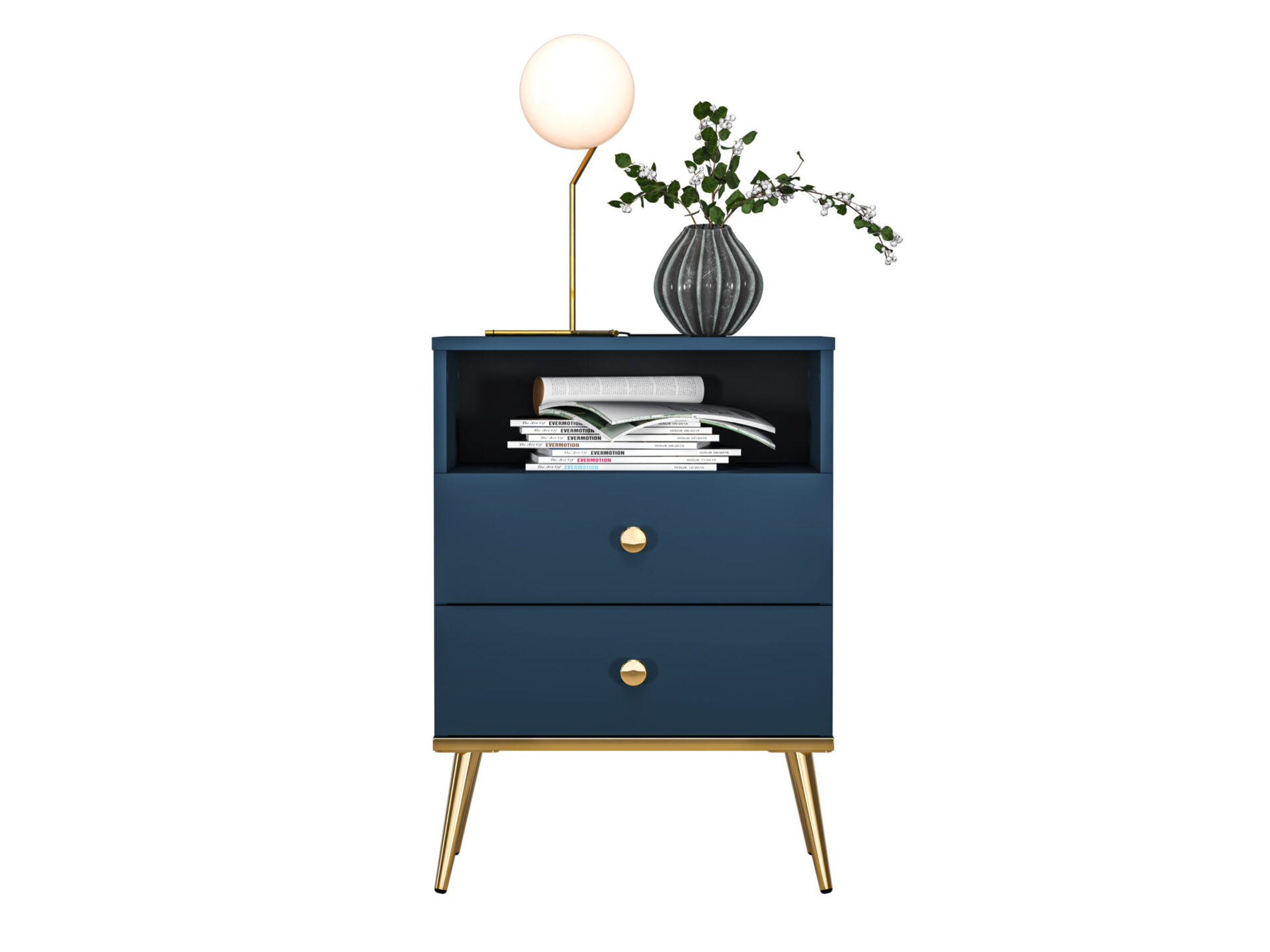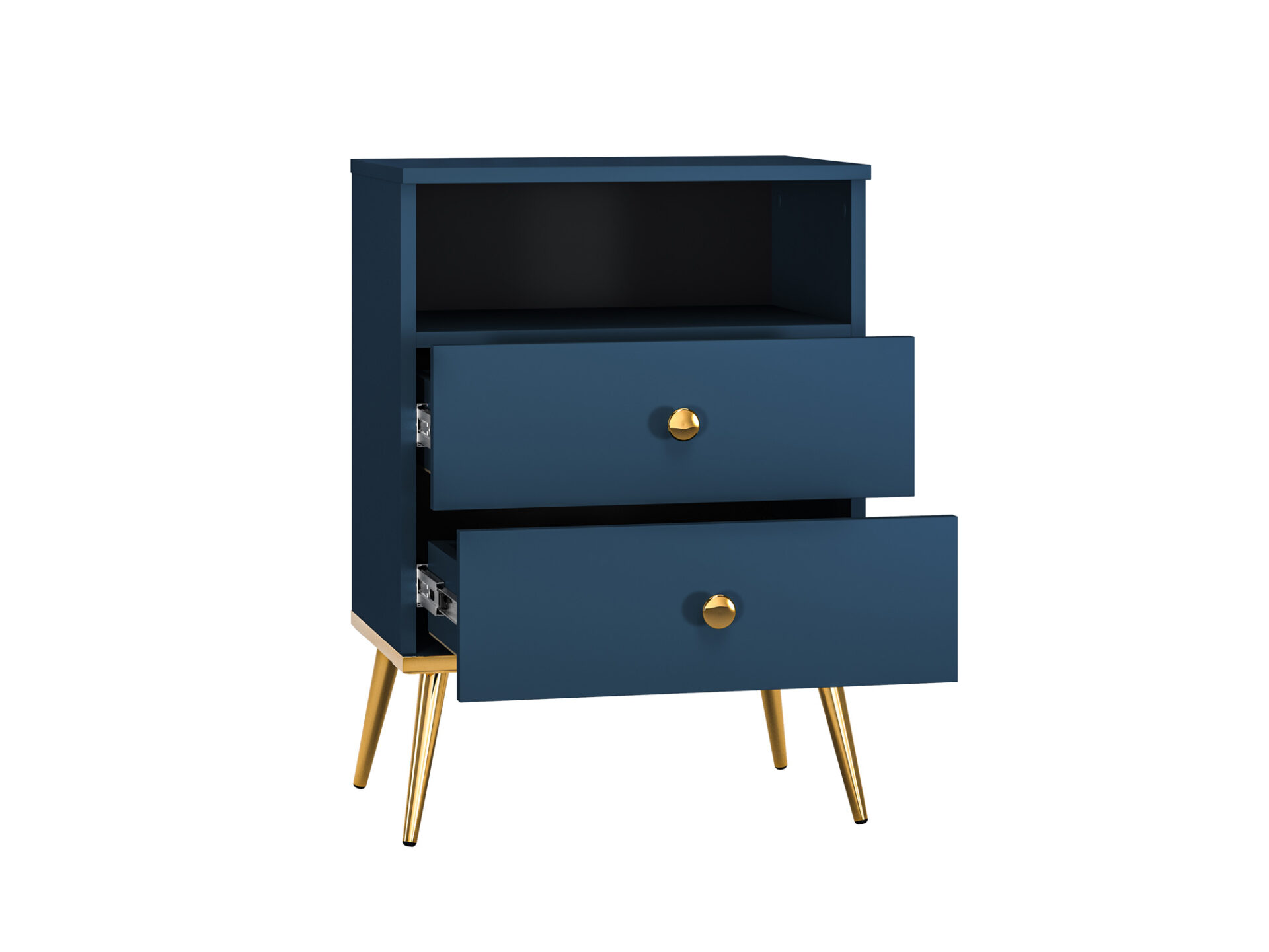 „Marine 10“ naktinis staliukas – tobulas baldas šiuolaikiškam miegamajam. Tvirtas stalviršis puikiai tinka naktinei lempai. Ant jo galite pastatyti stiklinę vandens arba pasidėti miegojimo knygą. Atvira lentyna puikiai tinka laikraščiams, žurnalams ar kitiems daiktams, kuriuos norite turėti po ranka, laikyti. Dviejuose kompaktiškuose stalčiuose tilps žvakės, rankų kremas, plaukų šepetys ir kiti būtini daiktai. Visiems „Marine“ kolekcijos baldams būdinga sodri, tamsiai mėlyna apdaila. Rankenos, kojelės ir apatinės plokštės fanera, dėl savo klasikinės auksinės spalvos, pabrėžia elegantišką ir nesenstantį „Marine“ baldų charakterį.