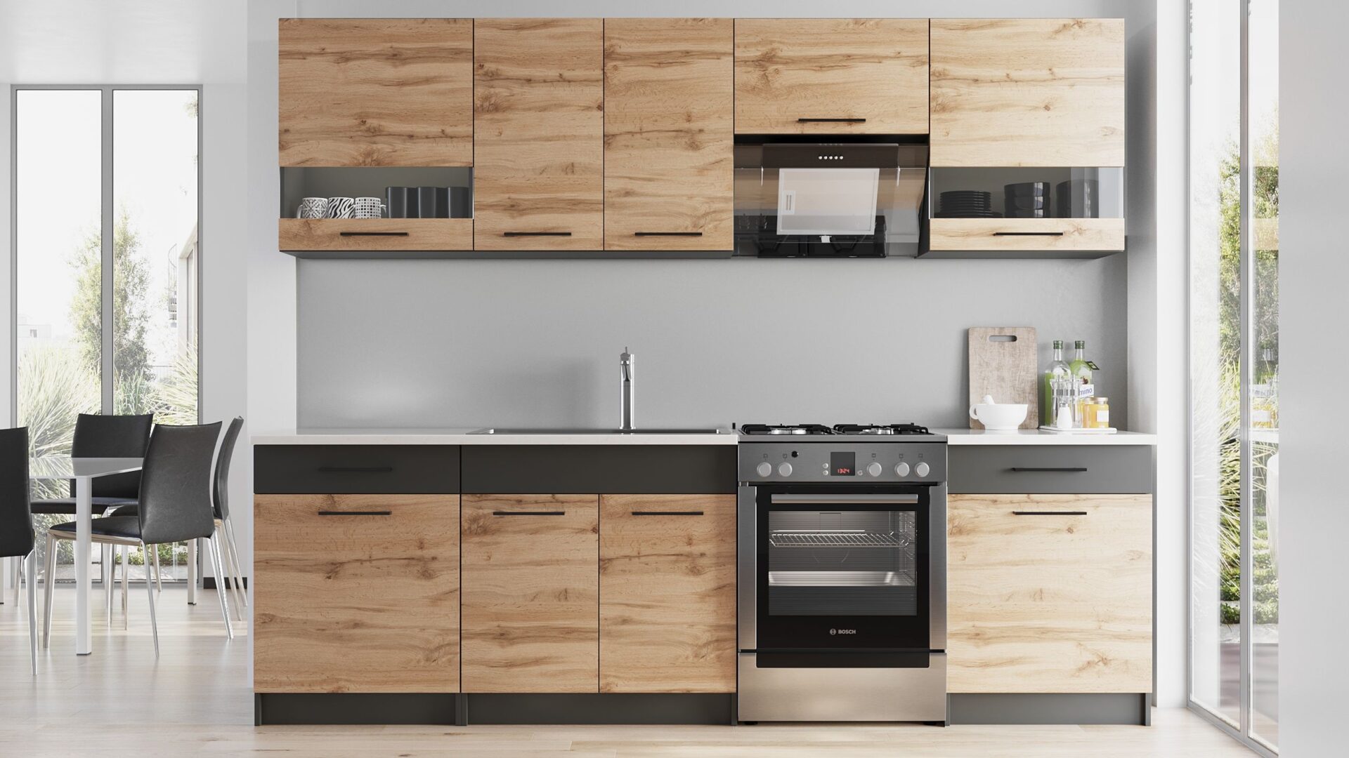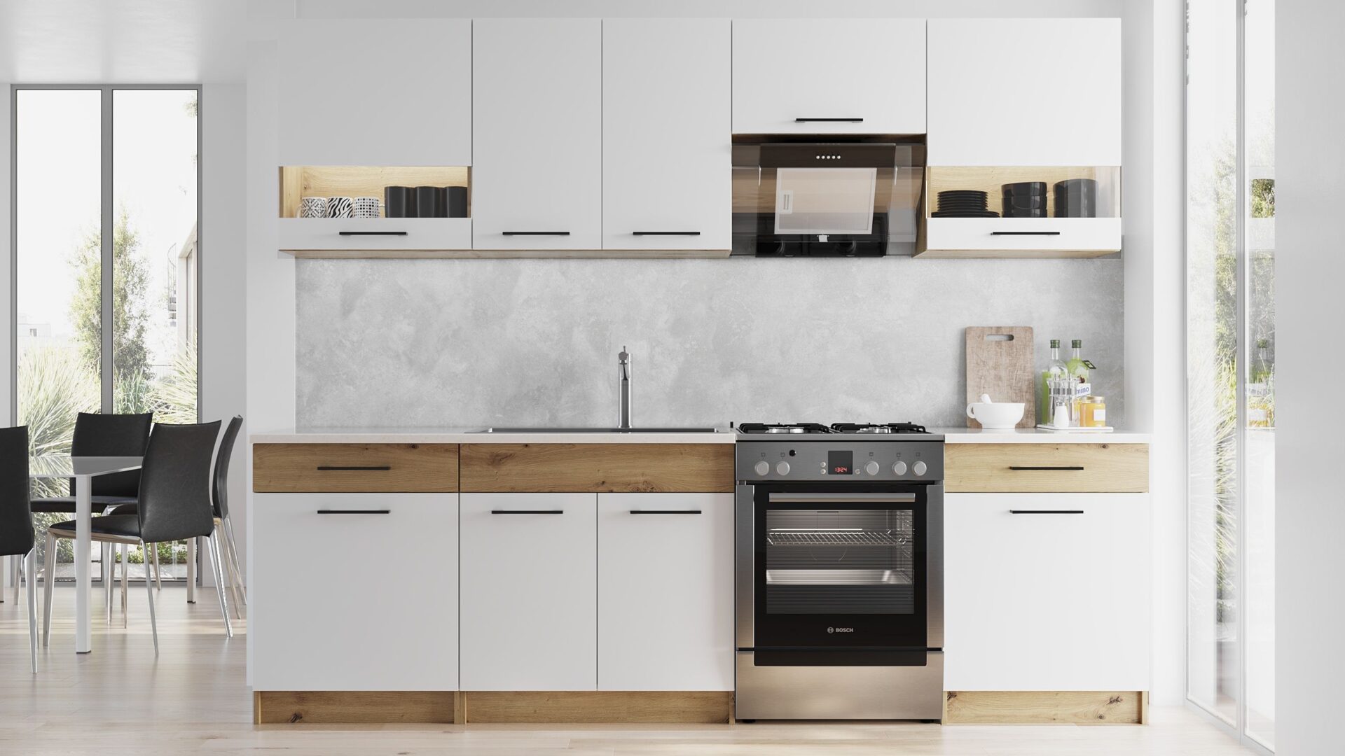 MARIO III virtuvė – tai paprastas, elegantiškas ir modernus virtuvės spintelių komplektas, pagamintas labai populiariu stiliumi. Šį komplektą sudaro 7 atskiros spintelės, kurias galima laisvai konfigūruoti, užtikrinant maksimalų naudojimo patogumą ir išdėstymo laisvę. Virtuvės komplekte yra stalviršis.